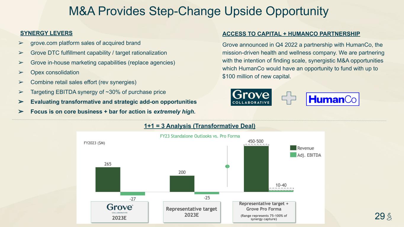 NOTES START FROM HERE AND GROW UP NO CONTENT BELOW THIS LINE CONTENT BELOW THIS LINE SUBTITLE BELOW THIS LINE TITLE CAN NOT GO ABOVE THIS LINE 3 59 76 0 114 88 120 159 144 130 186 128 102 163 157 172 196 200 255 255 255 0 0 0 247 243 228 3 59 76 247 243 228 29 SYNERGY LEVERS ➢ grove.com platform sales of acquired brand ➢ Grove DTC fulfillment capability / target rationalization ➢ Grove in-house marketing capabilities (replace agencies) ➢ Opex consolidation ➢ Combine retail sales effort (rev synergies) ➢ Targeting EBITDA synergy of ~30% of purchase price ➢ Evaluating transformative and strategic add-on opportunities ➢ Focus is on core business + bar for action is extremely high. M&A Provides Step-Change Upside Opportunity ACCESS TO CAPITAL + HUMANCO PARTNERSHIP Grove announced in Q4 2022 a partnership with HumanCo, the mission-driven health and wellness company. We are partnering with the intention of finding scale, synergistic M&A opportunities which HumanCo would have an opportunity to fund with up to $100 million of new capital. 1+1 = 3 Analysis (Transformative Deal)