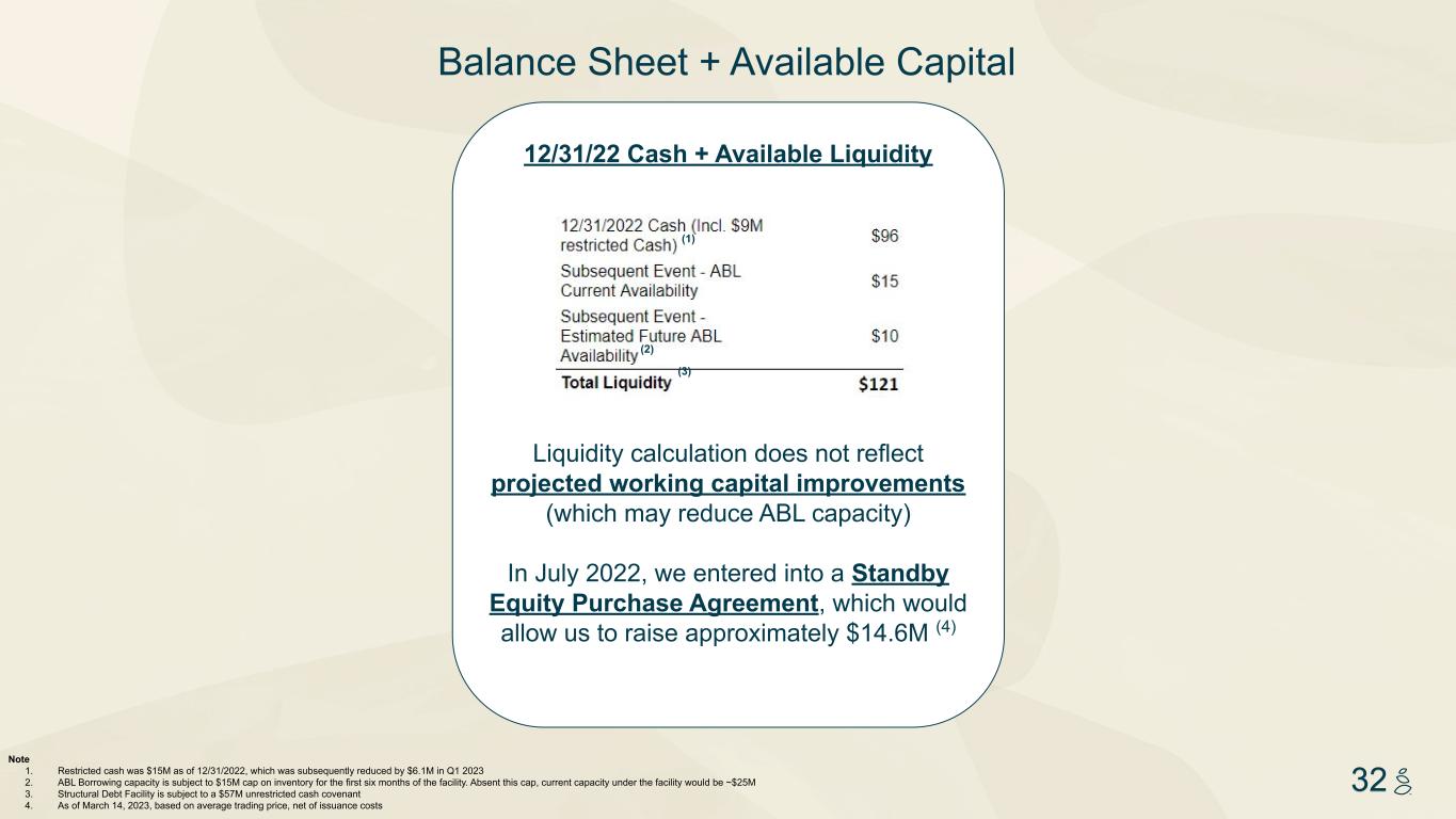 NOTES START FROM HERE AND GROW UP NO CONTENT BELOW THIS LINE CONTENT BELOW THIS LINE SUBTITLE BELOW THIS LINE TITLE CAN NOT GO ABOVE THIS LINE 3 59 76 0 114 88 120 159 144 130 186 128 102 163 157 172 196 200 255 255 255 0 0 0 247 243 228 3 59 76 247 243 228 32 Balance Sheet + Available Capital 12/31/22 Cash + Available Liquidity Liquidity calculation does not reflect projected working capital improvements (which may reduce ABL capacity) In July 2022, we entered into a Standby Equity Purchase Agreement, which would allow us to raise approximately $14.6M (4) Note 1. Restricted cash was $15M as of 12/31/2022, which was subsequently reduced by $6.1M in Q1 2023 2. ABL Borrowing capacity is subject to $15M cap on inventory for the first six months of the facility. Absent this cap, current capacity under the facility would be ~$25M 3. Structural Debt Facility is subject to a $57M unrestricted cash covenant 4. As of March 14, 2023, based on average trading price, net of issuance costs (2) (3) (1)