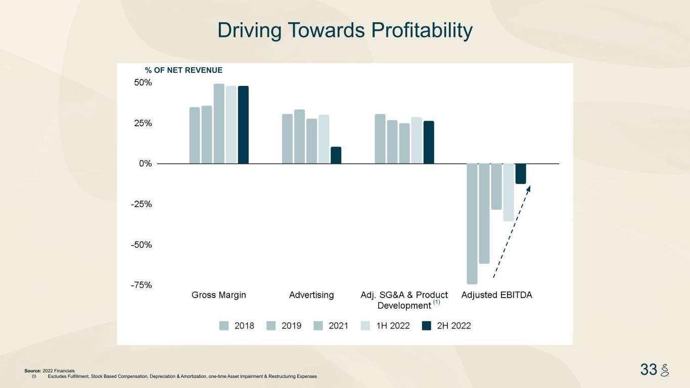 NOTES START FROM HERE AND GROW UP NO CONTENT BELOW THIS LINE CONTENT BELOW THIS LINE SUBTITLE BELOW THIS LINE TITLE CAN NOT GO ABOVE THIS LINE 3 59 76 0 114 88 120 159 144 130 186 128 102 163 157 172 196 200 255 255 255 0 0 0 247 243 228 3 59 76 247 243 228 33Source: 2022 Financials (1) Excludes Fulfillment, Stock Based Compensation, Depreciation & Amortization, one-time Asset Impairment & Restructuring Expenses % OF NET REVENUE Driving Towards Profitability (1)