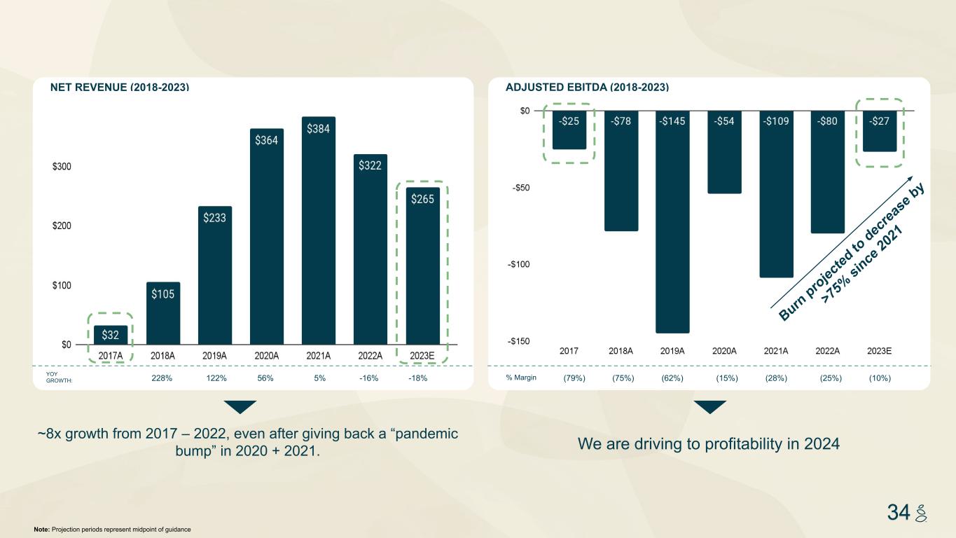 NOTES START FROM HERE AND GROW UP NO CONTENT BELOW THIS LINE CONTENT BELOW THIS LINE SUBTITLE BELOW THIS LINE TITLE CAN NOT GO ABOVE THIS LINE 3 59 76 0 114 88 120 159 144 130 186 128 102 163 157 172 196 200 255 255 255 0 0 0 247 243 228 3 59 76 247 243 228 34 NET REVENUE (2018-2023) ($MM) Note: Projection periods represent midpoint of guidance ~8x growth from 2017 – 2022, even after giving back a “pandemic bump” in 2020 + 2021. ADJUSTED EBITDA (2018-2023) (75%)% Margin (62%) (15%) (28%) (25%) (10%) Burn projec ted to dec rea se by >75 % si nce 20 21 We are driving to profitability in 2024 228%YOY GROWTH: 122% 56% 5% -16% -18% (79%)