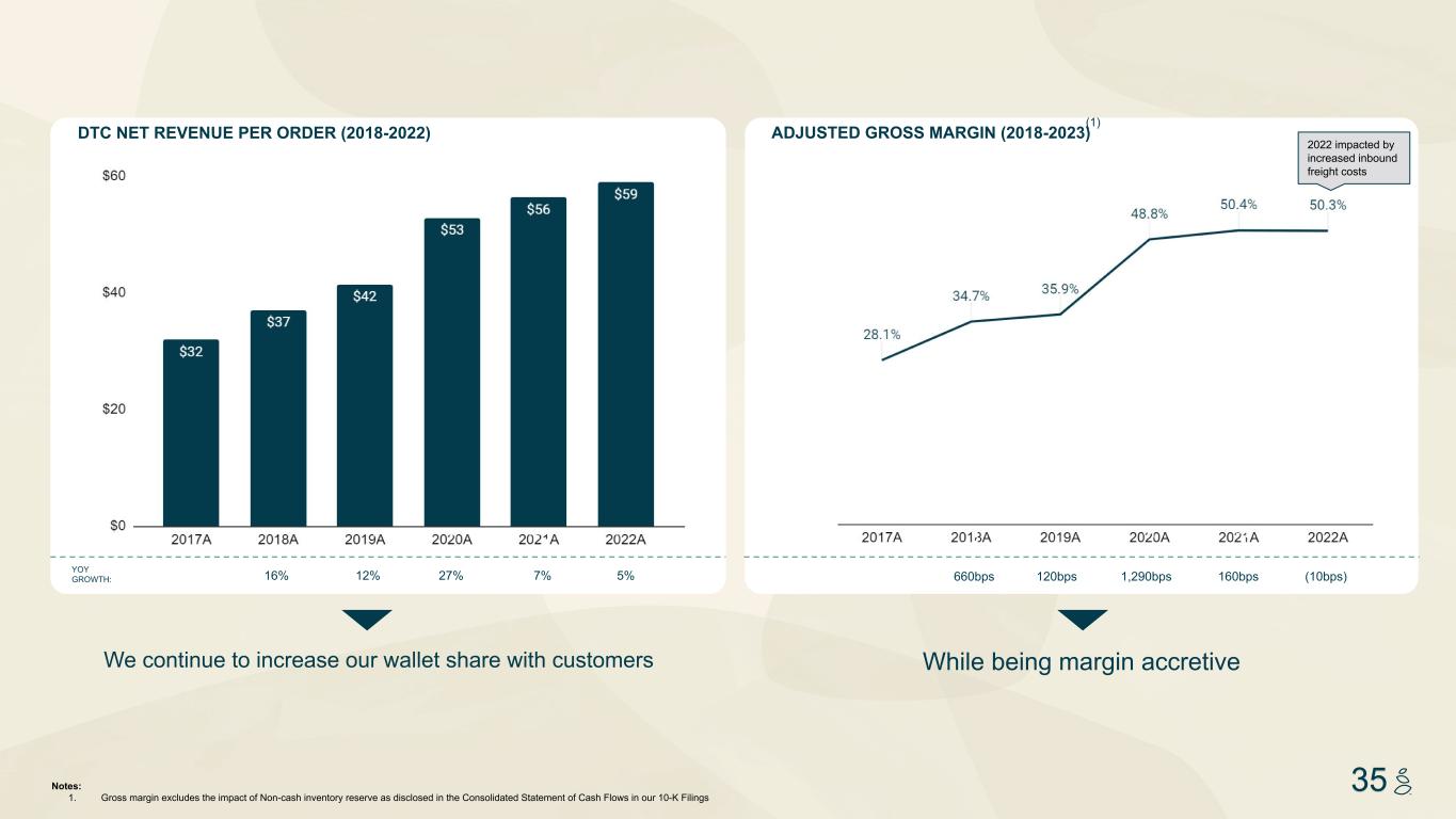 NOTES START FROM HERE AND GROW UP NO CONTENT BELOW THIS LINE CONTENT BELOW THIS LINE SUBTITLE BELOW THIS LINE TITLE CAN NOT GO ABOVE THIS LINE 3 59 76 0 114 88 120 159 144 130 186 128 102 163 157 172 196 200 255 255 255 0 0 0 247 243 228 3 59 76 247 243 228 35 DTC NET REVENUE PER ORDER (2018-2022) Notes: 1. Gross margin excludes the impact of Non-cash inventory reserve as disclosed in the Consolidated Statement of Cash Flows in our 10-K Filings We continue to increase our wallet share with customers ADJUSTED GROSS MARGIN (2018-2023) While being margin accretive YOY GROWTH: (1) 16% 12% 27% 7% 5% 660bps 120bps 1,290bps 160bps (10bps) 2022 impacted by increased inbound freight costs