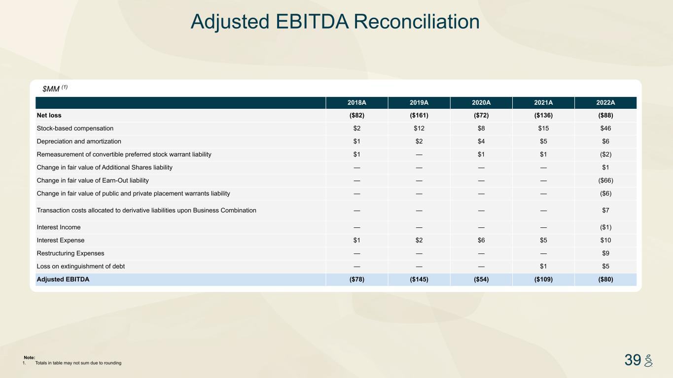 NOTES START FROM HERE AND GROW UP NO CONTENT BELOW THIS LINE CONTENT BELOW THIS LINE SUBTITLE BELOW THIS LINE TITLE CAN NOT GO ABOVE THIS LINE 3 59 76 0 114 88 120 159 144 130 186 128 102 163 157 172 196 200 255 255 255 0 0 0 247 243 228 3 59 76 247 243 228 39 Adjusted EBITDA Reconciliation $MM (1) Note: 1. Totals in table may not sum due to rounding 2018A 2019A 2020A 2021A 2022A Net loss ($82) ($161) ($72) ($136) ($88) Stock-based compensation $2 $12 $8 $15 $46 Depreciation and amortization $1 $2 $4 $5 $6 Remeasurement of convertible preferred stock warrant liability $1 — $1 $1 ($2) Change in fair value of Additional Shares liability — — — — $1 Change in fair value of Earn-Out liability — — — — ($66) Change in fair value of public and private placement warrants liability — — — — ($6) Transaction costs allocated to derivative liabilities upon Business Combination — — — — $7 Interest Income — — — — ($1) Interest Expense $1 $2 $6 $5 $10 Restructuring Expenses — — — — $9 Loss on extinguishment of debt — — — $1 $5 Adjusted EBITDA ($78) ($145) ($54) ($109) ($80)