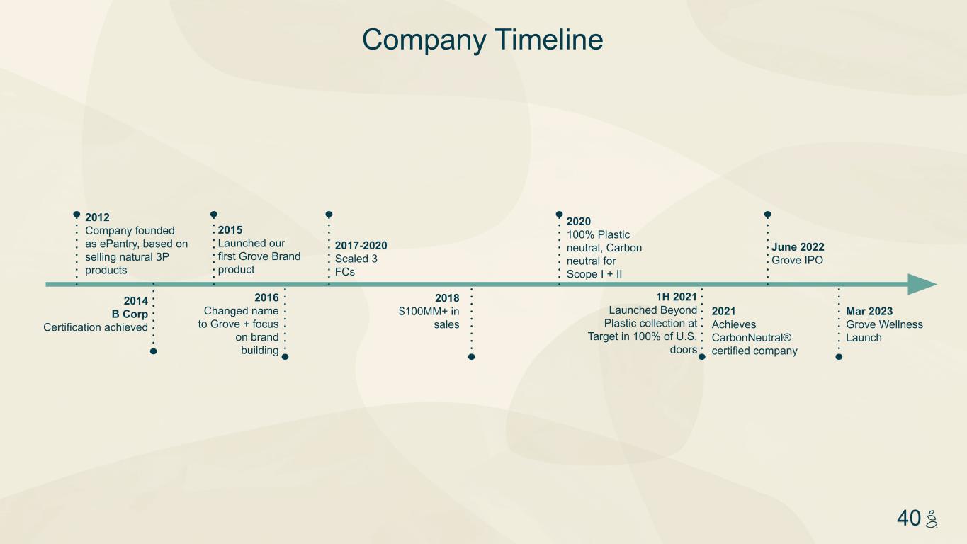 NOTES START FROM HERE AND GROW UP NO CONTENT BELOW THIS LINE CONTENT BELOW THIS LINE SUBTITLE BELOW THIS LINE TITLE CAN NOT GO ABOVE THIS LINE 3 59 76 0 114 88 120 159 144 130 186 128 102 163 157 172 196 200 255 255 255 0 0 0 247 243 228 3 59 76 247 243 228 40 Company Timeline 2016 Changed name to Grove + focus on brand building 1H 2021 Launched Beyond Plastic collection at Target in 100% of U.S. doors 2012 Company founded as ePantry, based on selling natural 3P products 2014 B Corp Certification achieved 2015 Launched our first Grove Brand product 2017-2020 Scaled 3 FCs 2020 100% Plastic neutral, Carbon neutral for Scope I + II June 2022 Grove IPO 2018 $100MM+ in sales 2021 Achieves CarbonNeutral® certified company Mar 2023 Grove Wellness Launch