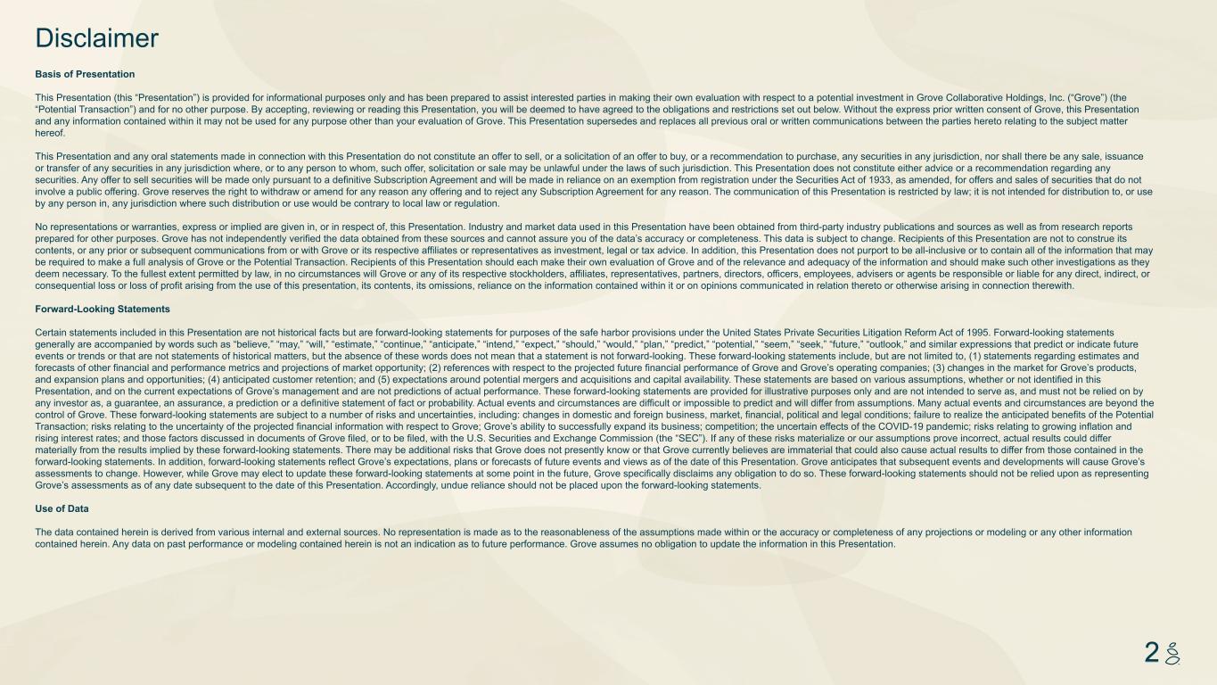 NOTES START FROM HERE AND GROW UP NO CONTENT BELOW THIS LINE CONTENT BELOW THIS LINE SUBTITLE BELOW THIS LINE TITLE CAN NOT GO ABOVE THIS LINE 3 59 76 0 114 88 120 159 144 130 186 128 102 163 157 172 196 200 255 255 255 0 0 0 247 243 228 3 59 76 247 243 228 2 Basis of Presentation This Presentation (this “Presentation”) is provided for informational purposes only and has been prepared to assist interested parties in making their own evaluation with respect to a potential investment in Grove Collaborative Holdings, Inc. (“Grove”) (the “Potential Transaction”) and for no other purpose. By accepting, reviewing or reading this Presentation, you will be deemed to have agreed to the obligations and restrictions set out below. Without the express prior written consent of Grove, this Presentation and any information contained within it may not be used for any purpose other than your evaluation of Grove. This Presentation supersedes and replaces all previous oral or written communications between the parties hereto relating to the subject matter hereof. This Presentation and any oral statements made in connection with this Presentation do not constitute an offer to sell, or a solicitation of an offer to buy, or a recommendation to purchase, any securities in any jurisdiction, nor shall there be any sale, issuance or transfer of any securities in any jurisdiction where, or to any person to whom, such offer, solicitation or sale may be unlawful under the laws of such jurisdiction. This Presentation does not constitute either advice or a recommendation regarding any securities. Any offer to sell securities will be made only pursuant to a definitive Subscription Agreement and will be made in reliance on an exemption from registration under the Securities Act of 1933, as amended, for offers and sales of securities that do not involve a public offering. Grove reserves the right to withdraw or amend for any reason any offering and to reject any Subscription Agreement for any reason. The communication of this Presentation is restricted by law; it is not intended for distribution to, or use by any person in, any jurisdiction where such distribution or use would be contrary to local law or regulation. No representations or warranties, express or implied are given in, or in respect of, this Presentation. Industry and market data used in this Presentation have been obtained from third-party industry publications and sources as well as from research reports prepared for other purposes. Grove has not independently verified the data obtained from these sources and cannot assure you of the data’s accuracy or completeness. This data is subject to change. Recipients of this Presentation are not to construe its contents, or any prior or subsequent communications from or with Grove or its respective affiliates or representatives as investment, legal or tax advice. In addition, this Presentation does not purport to be all-inclusive or to contain all of the information that may be required to make a full analysis of Grove or the Potential Transaction. Recipients of this Presentation should each make their own evaluation of Grove and of the relevance and adequacy of the information and should make such other investigations as they deem necessary. To the fullest extent permitted by law, in no circumstances will Grove or any of its respective stockholders, affiliates, representatives, partners, directors, officers, employees, advisers or agents be responsible or liable for any direct, indirect, or consequential loss or loss of profit arising from the use of this presentation, its contents, its omissions, reliance on the information contained within it or on opinions communicated in relation thereto or otherwise arising in connection therewith. Forward-Looking Statements Certain statements included in this Presentation are not historical facts but are forward-looking statements for purposes of the safe harbor provisions under the United States Private Securities Litigation Reform Act of 1995. Forward-looking statements generally are accompanied by words such as “believe,” “may,” “will,” “estimate,” “continue,” “anticipate,” “intend,” “expect,” “should,” “would,” “plan,” “predict,” “potential,” “seem,” “seek,” “future,” “outlook,” and similar expressions that predict or indicate future events or trends or that are not statements of historical matters, but the absence of these words does not mean that a statement is not forward-looking. These forward-looking statements include, but are not limited to, (1) statements regarding estimates and forecasts of other financial and performance metrics and projections of market opportunity; (2) references with respect to the projected future financial performance of Grove and Grove’s operating companies; (3) changes in the market for Grove’s products, and expansion plans and opportunities; (4) anticipated customer retention; and (5) expectations around potential mergers and acquisitions and capital availability. These statements are based on various assumptions, whether or not identified in this Presentation, and on the current expectations of Grove’s management and are not predictions of actual performance. These forward-looking statements are provided for illustrative purposes only and are not intended to serve as, and must not be relied on by any investor as, a guarantee, an assurance, a prediction or a definitive statement of fact or probability. Actual events and circumstances are difficult or impossible to predict and will differ from assumptions. Many actual events and circumstances are beyond the control of Grove. These forward-looking statements are subject to a number of risks and uncertainties, including: changes in domestic and foreign business, market, financial, political and legal conditions; failure to realize the anticipated benefits of the Potential Transaction; risks relating to 