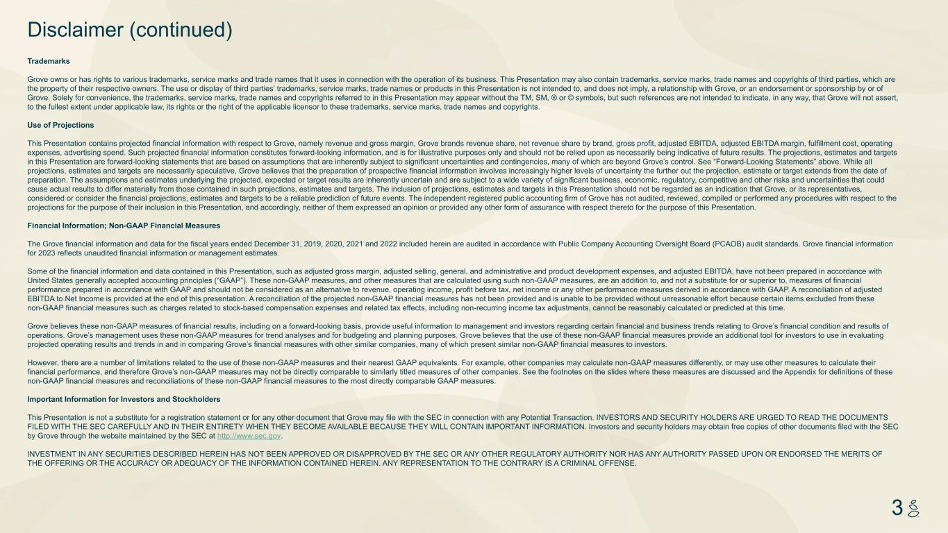 NOTES START FROM HERE AND GROW UP NO CONTENT BELOW THIS LINE CONTENT BELOW THIS LINE SUBTITLE BELOW THIS LINE TITLE CAN NOT GO ABOVE THIS LINE 3 59 76 0 114 88 120 159 144 130 186 128 102 163 157 172 196 200 255 255 255 0 0 0 247 243 228 3 59 76 247 243 228 3 Trademarks Grove owns or has rights to various trademarks, service marks and trade names that it uses in connection with the operation of its business. This Presentation may also contain trademarks, service marks, trade names and copyrights of third parties, which are the property of their respective owners. The use or display of third parties’ trademarks, service marks, trade names or products in this Presentation is not intended to, and does not imply, a relationship with Grove, or an endorsement or sponsorship by or of Grove. Solely for convenience, the trademarks, service marks, trade names and copyrights referred to in this Presentation may appear without the TM, SM, ® or © symbols, but such references are not intended to indicate, in any way, that Grove will not assert, to the fullest extent under applicable law, its rights or the right of the applicable licensor to these trademarks, service marks, trade names and copyrights. Use of Projections This Presentation contains projected financial information with respect to Grove, namely revenue and gross margin, Grove brands revenue share, net revenue share by brand, gross profit, adjusted EBITDA, adjusted EBITDA margin, fulfillment cost, operating expenses, advertising spend. Such projected financial information constitutes forward-looking information, and is for illustrative purposes only and should not be relied upon as necessarily being indicative of future results. The projections, estimates and targets in this Presentation are forward-looking statements that are based on assumptions that are inherently subject to significant uncertainties and contingencies, many of which are beyond Grove’s control. See “Forward-Looking Statements” above. While all projections, estimates and targets are necessarily speculative, Grove believes that the preparation of prospective financial information involves increasingly higher levels of uncertainty the further out the projection, estimate or target extends from the date of preparation. The assumptions and estimates underlying the projected, expected or target results are inherently uncertain and are subject to a wide variety of significant business, economic, regulatory, competitive and other risks and uncertainties that could cause actual results to differ materially from those contained in such projections, estimates and targets. The inclusion of projections, estimates and targets in this Presentation should not be regarded as an indication that Grove, or its representatives, considered or consider the financial projections, estimates and targets to be a reliable prediction of future events. The independent registered public accounting firm of Grove has not audited, reviewed, compiled or performed any procedures with respect to the projections for the purpose of their inclusion in this Presentation, and accordingly, neither of them expressed an opinion or provided any other form of assurance with respect thereto for the purpose of this Presentation. Financial Information; Non-GAAP Financial Measures The Grove financial information and data for the fiscal years ended December 31, 2019, 2020, 2021 and 2022 included herein are audited in accordance with Public Company Accounting Oversight Board (PCAOB) audit standards. Grove financial information for 2023 reflects unaudited financial information or management estimates. Some of the financial information and data contained in this Presentation, such as adjusted gross margin, adjusted selling, general, and administrative and product development expenses, and adjusted EBITDA, have not been prepared in accordance with United States generally accepted accounting principles (“GAAP”). These non-GAAP measures, and other measures that are calculated using such non-GAAP measures, are an addition to, and not a substitute for or superior to, measures of financial performance prepared in accordance with GAAP and should not be considered as an alternative to revenue, operating income, profit before tax, net income or any other performance measures derived in accordance with GAAP. A reconciliation of adjusted EBITDA to Net Income is provided at the end of this presentation. A reconciliation of the projected non-GAAP financial measures has not been provided and is unable to be provided without unreasonable effort because certain items excluded from these non-GAAP financial measures such as charges related to stock-based compensation expenses and related tax effects, including non-recurring income tax adjustments, cannot be reasonably calculated or predicted at this time. Grove believes these non-GAAP measures of financial results, including on a forward-looking basis, provide useful information to management and investors regarding certain financial and business trends relating to Grove’s financial condition and results of operations. Grove’s management uses these non-GAAP measures for trend analyses and for budgeting and planning purposes. Grove believes that the use of these non-GAAP financial measures provide an additional tool for investors to use in evaluating projected operating results and trends in and in comparing Grove’s financial measures with other similar companies, many of which present similar non-GAAP financial measures to investors. However, there are a number of limitations related to the use of these non-GAAP measures and their nearest GAAP equivalents. For example, other companies may calculate non-GAAP measures differently, or may use other measures to calculate their financial performance, and therefore Grove’s non-GAAP measures may not be directly comparable to similarly titled measures of other companies. See the footnotes on the slides where these measures are di