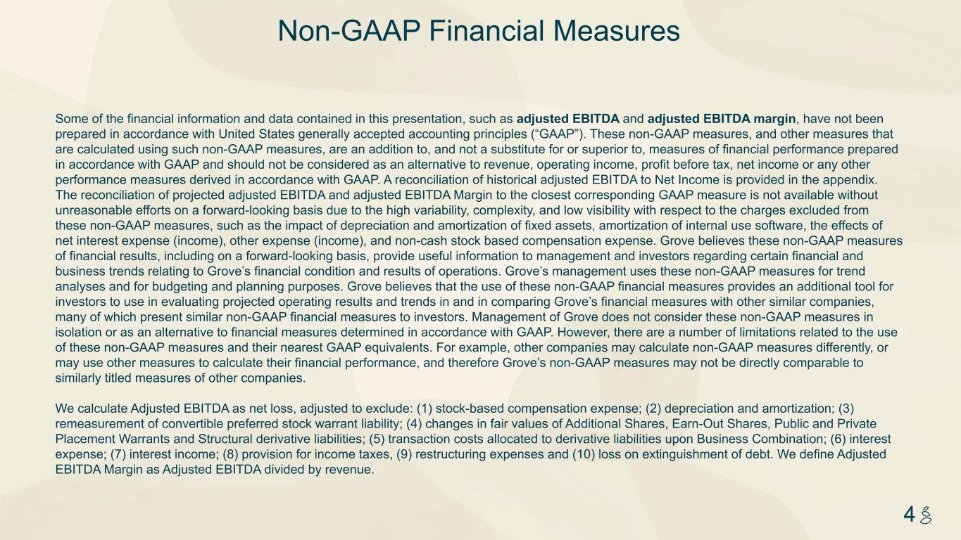 NOTES START FROM HERE AND GROW UP NO CONTENT BELOW THIS LINE CONTENT BELOW THIS LINE SUBTITLE BELOW THIS LINE TITLE CAN NOT GO ABOVE THIS LINE 3 59 76 0 114 88 120 159 144 130 186 128 102 163 157 172 196 200 255 255 255 0 0 0 247 243 228 3 59 76 247 243 228 4 Non-GAAP Financial Measures Some of the financial information and data contained in this presentation, such as adjusted EBITDA and adjusted EBITDA margin, have not been prepared in accordance with United States generally accepted accounting principles (“GAAP”). These non-GAAP measures, and other measures that are calculated using such non-GAAP measures, are an addition to, and not a substitute for or superior to, measures of financial performance prepared in accordance with GAAP and should not be considered as an alternative to revenue, operating income, profit before tax, net income or any other performance measures derived in accordance with GAAP. A reconciliation of historical adjusted EBITDA to Net Income is provided in the appendix. The reconciliation of projected adjusted EBITDA and adjusted EBITDA Margin to the closest corresponding GAAP measure is not available without unreasonable efforts on a forward-looking basis due to the high variability, complexity, and low visibility with respect to the charges excluded from these non-GAAP measures, such as the impact of depreciation and amortization of fixed assets, amortization of internal use software, the effects of net interest expense (income), other expense (income), and non-cash stock based compensation expense. Grove believes these non-GAAP measures of financial results, including on a forward-looking basis, provide useful information to management and investors regarding certain financial and business trends relating to Grove’s financial condition and results of operations. Grove’s management uses these non-GAAP measures for trend analyses and for budgeting and planning purposes. Grove believes that the use of these non-GAAP financial measures provides an additional tool for investors to use in evaluating projected operating results and trends in and in comparing Grove’s financial measures with other similar companies, many of which present similar non-GAAP financial measures to investors. Management of Grove does not consider these non-GAAP measures in isolation or as an alternative to financial measures determined in accordance with GAAP. However, there are a number of limitations related to the use of these non-GAAP measures and their nearest GAAP equivalents. For example, other companies may calculate non-GAAP measures differently, or may use other measures to calculate their financial performance, and therefore Grove’s non-GAAP measures may not be directly comparable to similarly titled measures of other companies. We calculate Adjusted EBITDA as net loss, adjusted to exclude: (1) stock-based compensation expense; (2) depreciation and amortization; (3) remeasurement of convertible preferred stock warrant liability; (4) changes in fair values of Additional Shares, Earn-Out Shares, Public and Private Placement Warrants and Structural derivative liabilities; (5) transaction costs allocated to derivative liabilities upon Business Combination; (6) interest expense; (7) interest income; (8) provision for income taxes, (9) restructuring expenses and (10) loss on extinguishment of debt. We define Adjusted EBITDA Margin as Adjusted EBITDA divided by revenue.