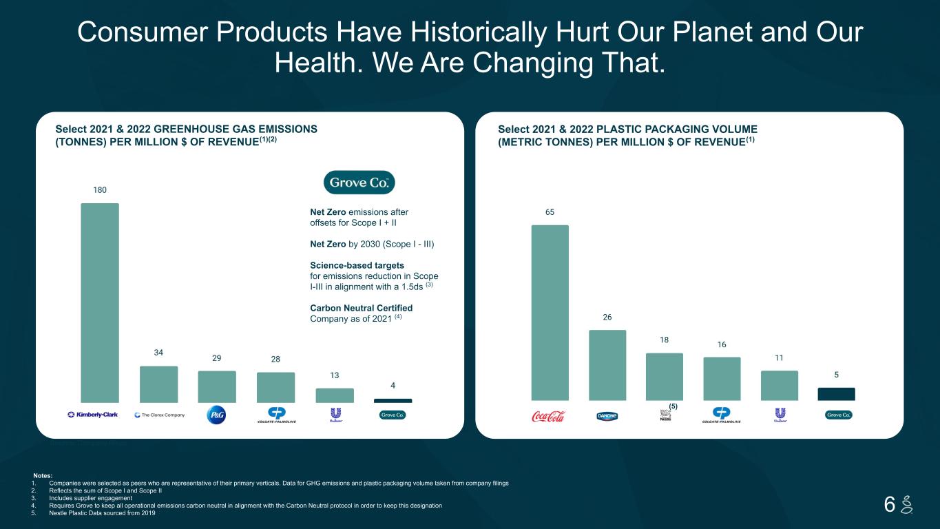 NOTES START FROM HERE AND GROW UP NO CONTENT BELOW THIS LINE CONTENT BELOW THIS LINE SUBTITLE BELOW THIS LINE TITLE CAN NOT GO ABOVE THIS LINE 3 59 76 0 114 88 120 159 144 130 186 128 102 163 157 172 196 200 255 255 255 0 0 0 247 243 228 3 59 76 247 243 228 6 Consumer Products Have Historically Hurt Our Planet and Our Health. We Are Changing That. Source: Company filings Net Zero emissions after offsets for Scope I + II Net Zero by 2030 (Scope I - III) Science-based targets for emissions reduction in Scope I-III in alignment with a 1.5ds (3) Carbon Neutral Certified Company as of 2021 (4) Select 2021 & 2022 GREENHOUSE GAS EMISSIONS (TONNES) PER MILLION $ OF REVENUE(1)(2) Notes: 1. Companies were selected as peers who are representative of their primary verticals. Data for GHG emissions and plastic packaging volume taken from company filings 2. Reflects the sum of Scope I and Scope II 3. Includes supplier engagement 4. Requires Grove to keep all operational emissions carbon neutral in alignment with the Carbon Neutral protocol in order to keep this designation 5. Nestle Plastic Data sourced from 2019 Select 2021 & 2022 PLASTIC PACKAGING VOLUME (METRIC TONNES) PER MILLION $ OF REVENUE(1) (5)