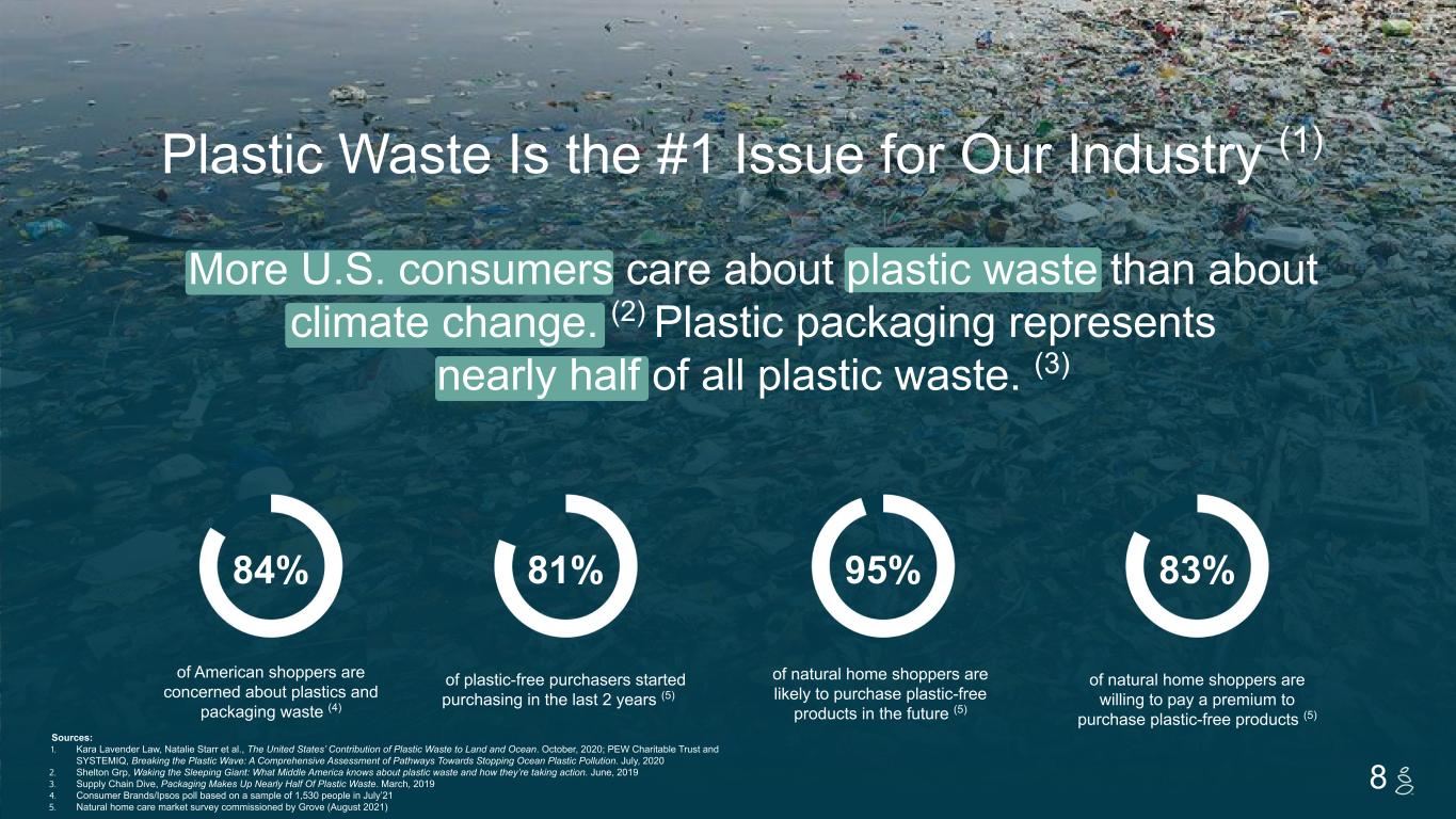 NOTES START FROM HERE AND GROW UP NO CONTENT BELOW THIS LINE CONTENT BELOW THIS LINE SUBTITLE BELOW THIS LINE TITLE CAN NOT GO ABOVE THIS LINE 3 59 76 0 114 88 120 159 144 130 186 128 102 163 157 172 196 200 255 255 255 0 0 0 247 243 228 3 59 76 247 243 228 8 of plastic-free purchasers started purchasing in the last 2 years (5) of American shoppers are concerned about plastics and packaging waste (4) of natural home shoppers are willing to pay a premium to purchase plastic-free products (5) of natural home shoppers are likely to purchase plastic-free products in the future (5) Plastic Waste Is the #1 Issue for Our Industry (1) Sources: 1. Kara Lavender Law, Natalie Starr et al., The United States’ Contribution of Plastic Waste to Land and Ocean. October, 2020; PEW Charitable Trust and SYSTEMIQ, Breaking the Plastic Wave: A Comprehensive Assessment of Pathways Towards Stopping Ocean Plastic Pollution. July, 2020 2. Shelton Grp, Waking the Sleeping Giant: What Middle America knows about plastic waste and how they’re taking action. June, 2019 3. Supply Chain Dive, Packaging Makes Up Nearly Half Of Plastic Waste. March, 2019 4. Consumer Brands/Ipsos poll based on a sample of 1,530 people in July’21 5. Natural home care market survey commissioned by Grove (August 2021) More U.S. consumers care about plastic waste than about climate change. (2) Plastic packaging represents nearly half of all plastic waste. (3) 84% 81% 95% 83%