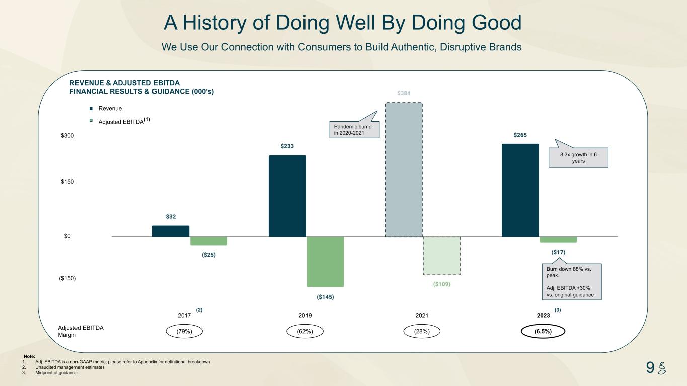 NOTES START FROM HERE AND GROW UP NO CONTENT BELOW THIS LINE CONTENT BELOW THIS LINE SUBTITLE BELOW THIS LINE TITLE CAN NOT GO ABOVE THIS LINE 3 59 76 0 114 88 120 159 144 130 186 128 102 163 157 172 196 200 255 255 255 0 0 0 247 243 228 3 59 76 247 243 228 9 A History of Doing Well By Doing Good We Use Our Connection with Consumers to Build Authentic, Disruptive Brands Note: 1. Adj. EBITDA is a non-GAAP metric; please refer to Appendix for definitional breakdown 2. Unaudited management estimates 3. Midpoint of guidance Revenue Adjusted EBITDA(1) 8.3x growth in 6 years REVENUE & ADJUSTED EBITDA FINANCIAL RESULTS & GUIDANCE (000’s) Pandemic bump in 2020-2021 (2) $300 $150 $0 ($150) Burn down 88% vs. peak. Adj. EBITDA +30% vs. original guidance 2017 2019 2021 (79%)Adjusted EBITDA Margin (62%) (28%) 2023 (6.5%) (3)