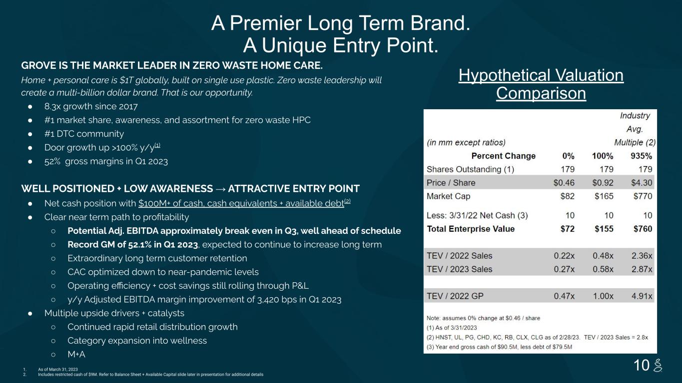 NOTES START FROM HERE AND GROW UP NO CONTENT BELOW THIS LINE CONTENT BELOW THIS LINE SUBTITLE BELOW THIS LINE TITLE CAN NOT GO ABOVE THIS LINE 3 59 76 0 114 88 120 159 144 130 186 128 102 163 157 172 196 200 255 255 255 0 0 0 247 243 228 3 59 76 247 243 228 10 GROVE IS THE MARKET LEADER IN ZERO WASTE HOME CARE. Home + personal care is $1T globally, built on single use plastic. Zero waste leadership will create a multi-billion dollar brand. That is our opportunity. ● 8.3x growth since 2017 ● #1 market share, awareness, and assortment for zero waste HPC ● #1 DTC community ● Door growth up >100% y/y(1) ● 52% gross margins in Q1 2023 WELL POSITIONED + LOW AWARENESS → ATTRACTIVE ENTRY POINT ● Net cash position with $100M+ of cash, cash equivalents + available debt(2) ● Clear near term path to profitability ○ Potential Adj. EBITDA approximately break even in Q3, well ahead of schedule ○ Record GM of 52.1% in Q1 2023, expected to continue to increase long term ○ Extraordinary long term customer retention ○ CAC optimized down to near-pandemic levels ○ Operating efficiency + cost savings still rolling through P&L ○ y/y Adjusted EBITDA margin improvement of 3,420 bps in Q1 2023 ● Multiple upside drivers + catalysts ○ Continued rapid retail distribution growth ○ Category expansion into wellness ○ M+A A Premier Long Term Brand. A Unique Entry Point. Hypothetical Valuation Comparison 1. As of March 31, 2023 2. Includes restricted cash of $9M. Refer to Balance Sheet + Available Capital slide later in presentation for additional details