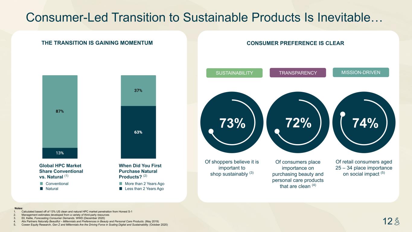 NOTES START FROM HERE AND GROW UP NO CONTENT BELOW THIS LINE CONTENT BELOW THIS LINE SUBTITLE BELOW THIS LINE TITLE CAN NOT GO ABOVE THIS LINE 3 59 76 0 114 88 120 159 144 130 186 128 102 163 157 172 196 200 255 255 255 0 0 0 247 243 228 3 59 76 247 243 228 12 Notes: 1. Calculated based off of 13% US clean and natural HPC market penetration from Honest S-1 2. Management estimates developed from a variety of third-party resources 3. Ell, Kellie, Forecasting Consumer Demands. WWD (December 2020) 4. Alix Partners Naturally Beautiful – Millennials and Preferences in Beauty and Personal Care Products. (May 2019) 5. Cowen Equity Research, Gen Z and Millennials Are the Driving Force in Scaling Digital and Sustainability. (October 2020) THE TRANSITION IS GAINING MOMENTUM When Did You First Purchase Natural Products? (2) More than 2 Years Ago Less than 2 Years Ago Conventional Natural Global HPC Market Share Conventional vs. Natural (1) Consumer-Led Transition to Sustainable Products Is Inevitable… Of retail consumers aged 25 – 34 place importance on social impact (5) Of consumers place importance on purchasing beauty and personal care products that are clean (4) TRANSPARENCY Of shoppers believe it is important to shop sustainably (3) SUSTAINABILITY CONSUMER PREFERENCE IS CLEAR MISSION-DRIVEN 74%72%73%