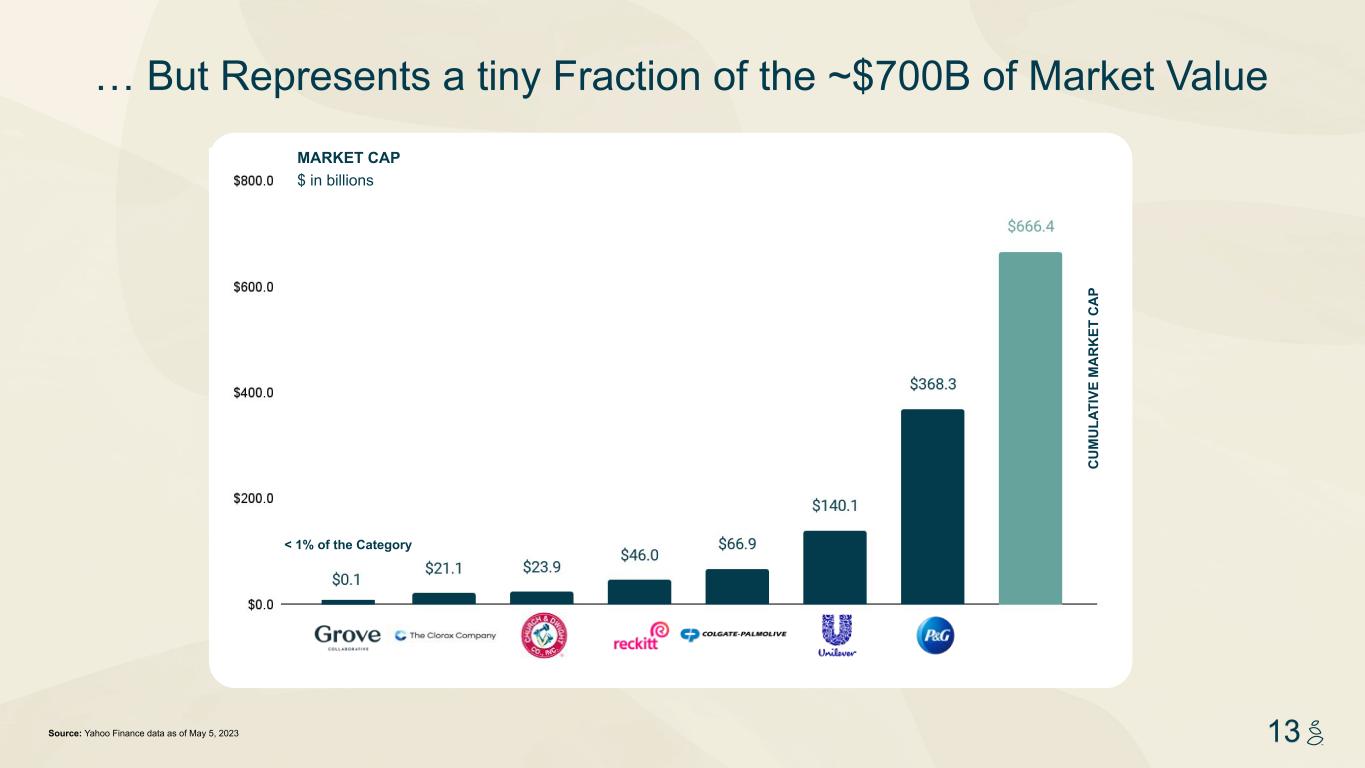 NOTES START FROM HERE AND GROW UP NO CONTENT BELOW THIS LINE CONTENT BELOW THIS LINE SUBTITLE BELOW THIS LINE TITLE CAN NOT GO ABOVE THIS LINE 3 59 76 0 114 88 120 159 144 130 186 128 102 163 157 172 196 200 255 255 255 0 0 0 247 243 228 3 59 76 247 243 228 13Source: Yahoo Finance data as of May 5, 2023 … But Represents a tiny Fraction of the ~$700B of Market Value < 1% of the Category C U M U LA TI VE M A R K ET C A P MARKET CAP $ in billions