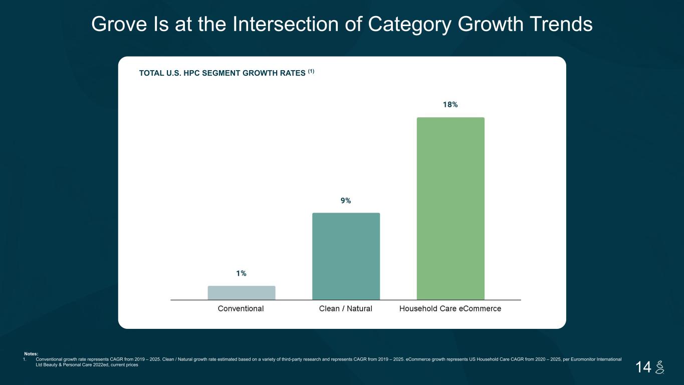 NOTES START FROM HERE AND GROW UP NO CONTENT BELOW THIS LINE CONTENT BELOW THIS LINE SUBTITLE BELOW THIS LINE TITLE CAN NOT GO ABOVE THIS LINE 3 59 76 0 114 88 120 159 144 130 186 128 102 163 157 172 196 200 255 255 255 0 0 0 247 243 228 3 59 76 247 243 228 14 TOTAL U.S. HPC SEGMENT GROWTH RATES (1) Grove Is at the Intersection of Category Growth Trends Notes: 1. Conventional growth rate represents CAGR from 2019 – 2025. Clean / Natural growth rate estimated based on a variety of third-party research and represents CAGR from 2019 – 2025. eCommerce growth represents US Household Care CAGR from 2020 – 2025, per Euromonitor International Ltd Beauty & Personal Care 2022ed, current prices