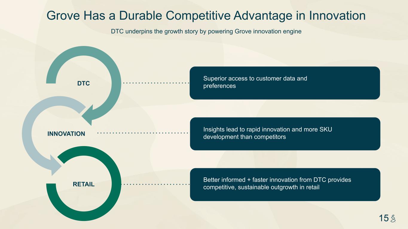 NOTES START FROM HERE AND GROW UP NO CONTENT BELOW THIS LINE CONTENT BELOW THIS LINE SUBTITLE BELOW THIS LINE TITLE CAN NOT GO ABOVE THIS LINE 3 59 76 0 114 88 120 159 144 130 186 128 102 163 157 172 196 200 255 255 255 0 0 0 247 243 228 3 59 76 247 243 228 15 Superior access to customer data and preferences Insights lead to rapid innovation and more SKU development than competitors Better informed + faster innovation from DTC provides competitive, sustainable outgrowth in retail DTC underpins the growth story by powering Grove innovation engine Grove Has a Durable Competitive Advantage in Innovation DTC INNOVATION RETAIL