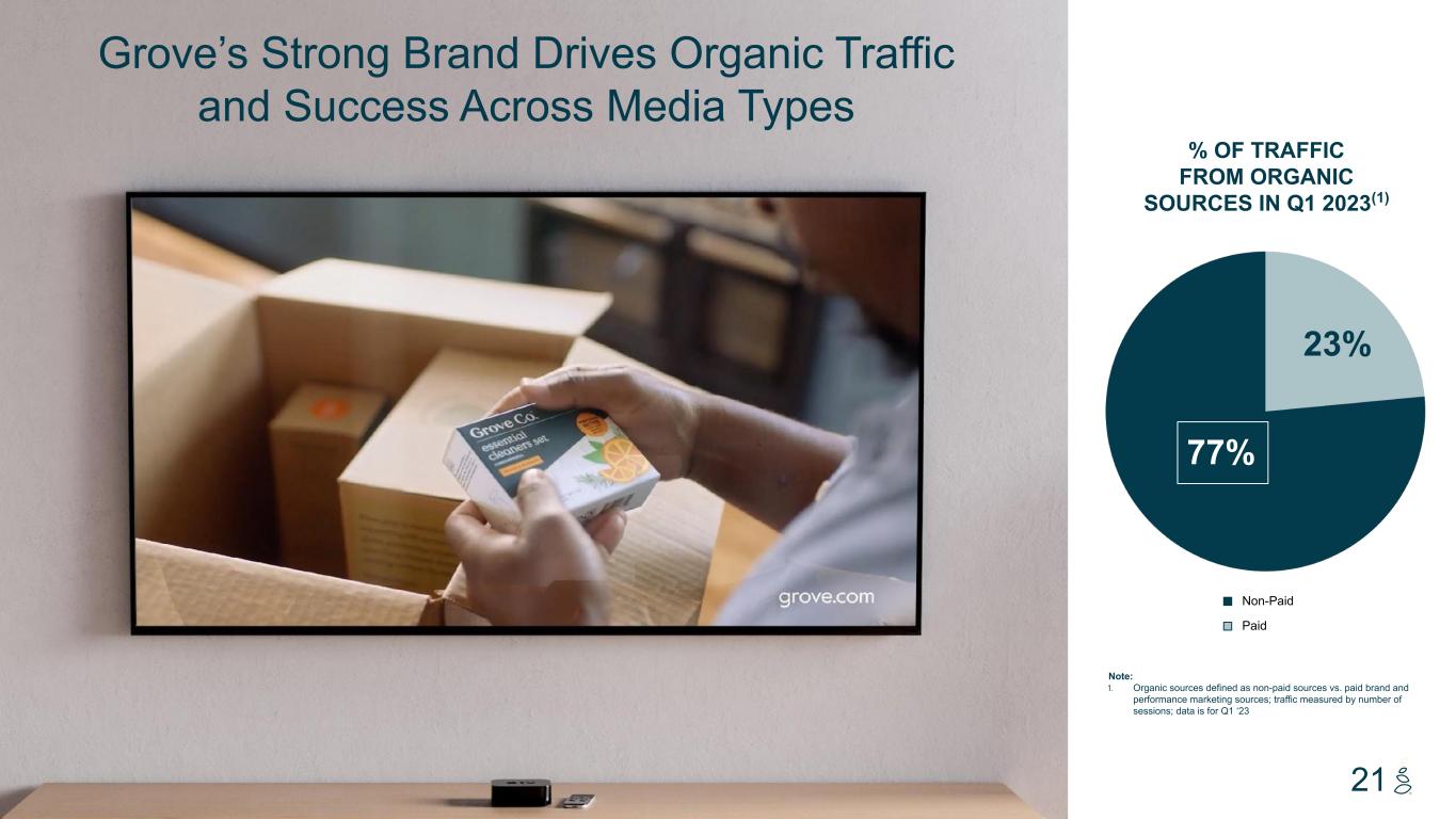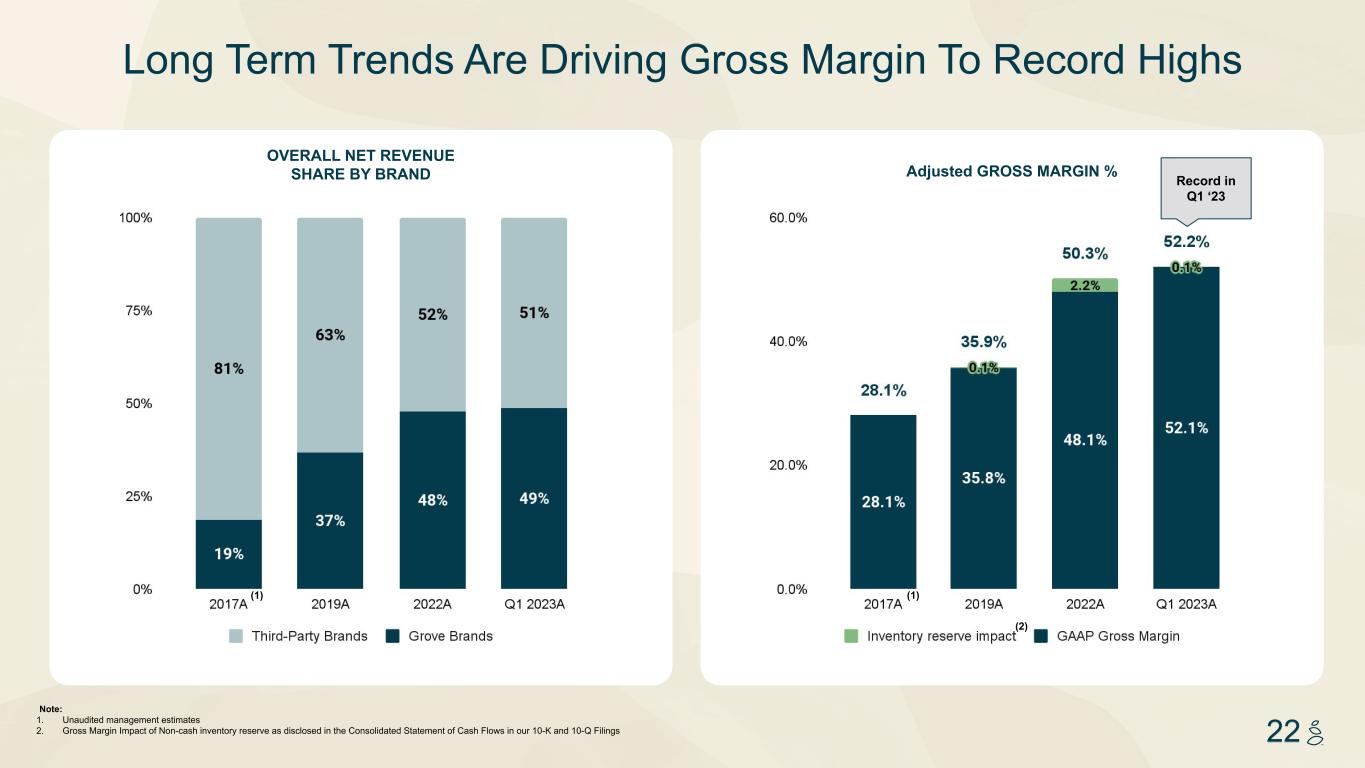 NOTES START FROM HERE AND GROW UP NO CONTENT BELOW THIS LINE CONTENT BELOW THIS LINE SUBTITLE BELOW THIS LINE TITLE CAN NOT GO ABOVE THIS LINE 3 59 76 0 114 88 120 159 144 130 186 128 102 163 157 172 196 200 255 255 255 0 0 0 247 243 228 3 59 76 247 243 228 21 % OF TRAFFIC FROM ORGANIC SOURCES IN Q1 2023(1) Grove’s Strong Brand Drives Organic Traffic and Success Across Media Types 21 Note: 1. Organic sources defined as non-paid sources vs. paid brand and performance marketing sources; traffic measured by number of sessions; data is for Q1 ‘23 77% Non-Paid Paid 23%