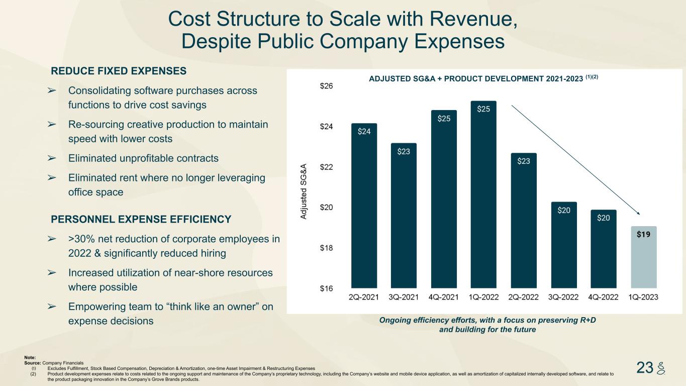 NOTES START FROM HERE AND GROW UP NO CONTENT BELOW THIS LINE CONTENT BELOW THIS LINE SUBTITLE BELOW THIS LINE TITLE CAN NOT GO ABOVE THIS LINE 3 59 76 0 114 88 120 159 144 130 186 128 102 163 157 172 196 200 255 255 255 0 0 0 247 243 228 3 59 76 247 243 228 23 REDUCE FIXED EXPENSES ➢ Consolidating software purchases across functions to drive cost savings ➢ Re-sourcing creative production to maintain speed with lower costs ➢ Eliminated unprofitable contracts ➢ Eliminated rent where no longer leveraging office space PERSONNEL EXPENSE EFFICIENCY ➢ >30% net reduction of corporate employees in 2022 & significantly reduced hiring ➢ Increased utilization of near-shore resources where possible ➢ Empowering team to “think like an owner” on expense decisions Cost Structure to Scale with Revenue, Despite Public Company Expenses Note: Source: Company Financials (1) Excludes Fulfillment, Stock Based Compensation, Depreciation & Amortization, one-time Asset Impairment & Restructuring Expenses (2) Product development expenses relate to costs related to the ongoing support and maintenance of the Company’s proprietary technology, including the Company’s website and mobile device application, as well as amortization of capitalized internally developed software, and relate to the product packaging innovation in the Company’s Grove Brands products. 1 Ongoing efficiency efforts, with a focus on preserving R+D and building for the future ADJUSTED SG&A + PRODUCT DEVELOPMENT 2021-2023 (1)(2)