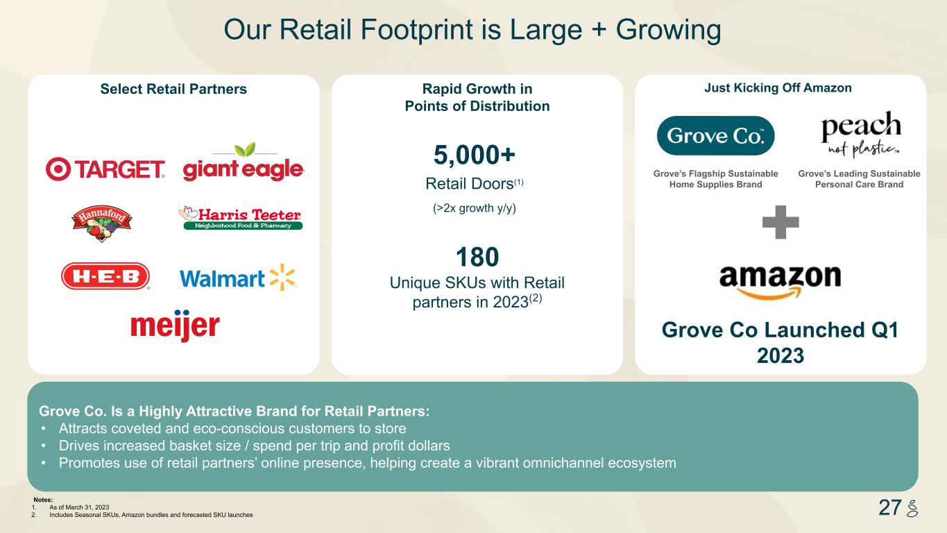 NOTES START FROM HERE AND GROW UP NO CONTENT BELOW THIS LINE CONTENT BELOW THIS LINE SUBTITLE BELOW THIS LINE TITLE CAN NOT GO ABOVE THIS LINE 3 59 76 0 114 88 120 159 144 130 186 128 102 163 157 172 196 200 255 255 255 0 0 0 247 243 228 3 59 76 247 243 228 26 Bringing Grove Co. to Retail Distribution is a Game Changing Opportunity Sources: 1. Per Euromonitor International Ltd, Beauty & Personal Care 2022ed, Home Care 2022ed, Pet Care 2022ed, Consumer Health 2022ed, and Tissue & Hygiene 2022ed; aggregation of beauty, personal care, home care, pet care (excluding food), baby care (diapers and wipes), and vitamins and dietary supplements 2. Management estimates developed from a variety of third-party resources CURRENT SALES CHANNEL U.S. Vertical HPC eCommerce Sales: <$20.0Bn (2) 2021-2025 FOCUS $180Bn (1) U.S. HPC Retail Industry 2023-2030 FOCUS ~$1 Trillion (1) Global HPC Retail Industry The Retail Opportunity is Still Early Days