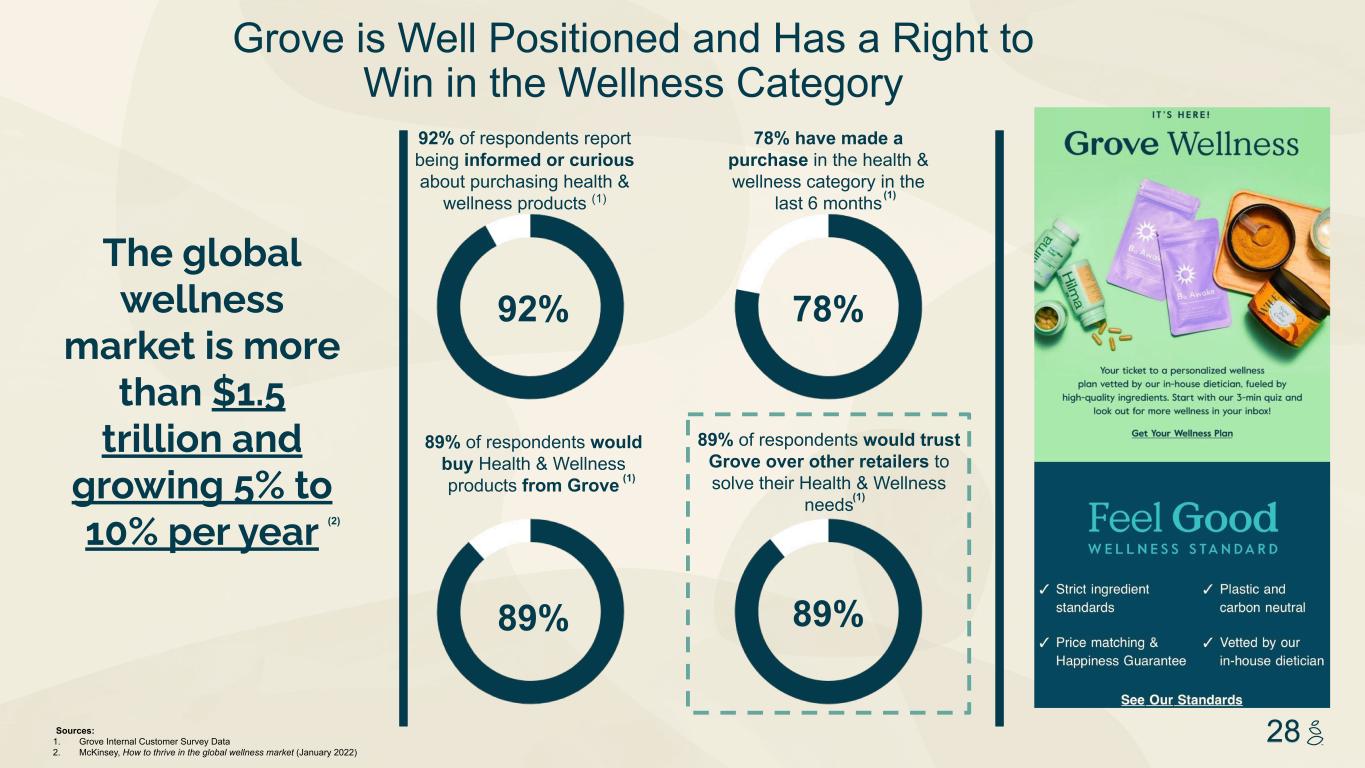 NOTES START FROM HERE AND GROW UP NO CONTENT BELOW THIS LINE CONTENT BELOW THIS LINE SUBTITLE BELOW THIS LINE TITLE CAN NOT GO ABOVE THIS LINE 3 59 76 0 114 88 120 159 144 130 186 128 102 163 157 172 196 200 255 255 255 0 0 0 247 243 228 3 59 76 247 243 228 27 Our Retail Footprint is Large + Growing Grove Co. Is a Highly Attractive Brand for Retail Partners: • Attracts coveted and eco-conscious customers to store • Drives increased basket size / spend per trip and profit dollars • Promotes use of retail partners’ online presence, helping create a vibrant omnichannel ecosystem Select Retail Partners Rapid Growth in Points of Distribution 5,000+ Retail Doors(1) (>2x growth y/y) 180 Unique SKUs with Retail partners in 2023(2) Grove Co Launched Q1 2023 Grove’s Leading Sustainable Personal Care Brand Grove’s Flagship Sustainable Home Supplies Brand Just Kicking Off Amazon Notes: 1. As of March 31, 2023 2. Includes Seasonal SKUs, Amazon bundles and forecasted SKU launches