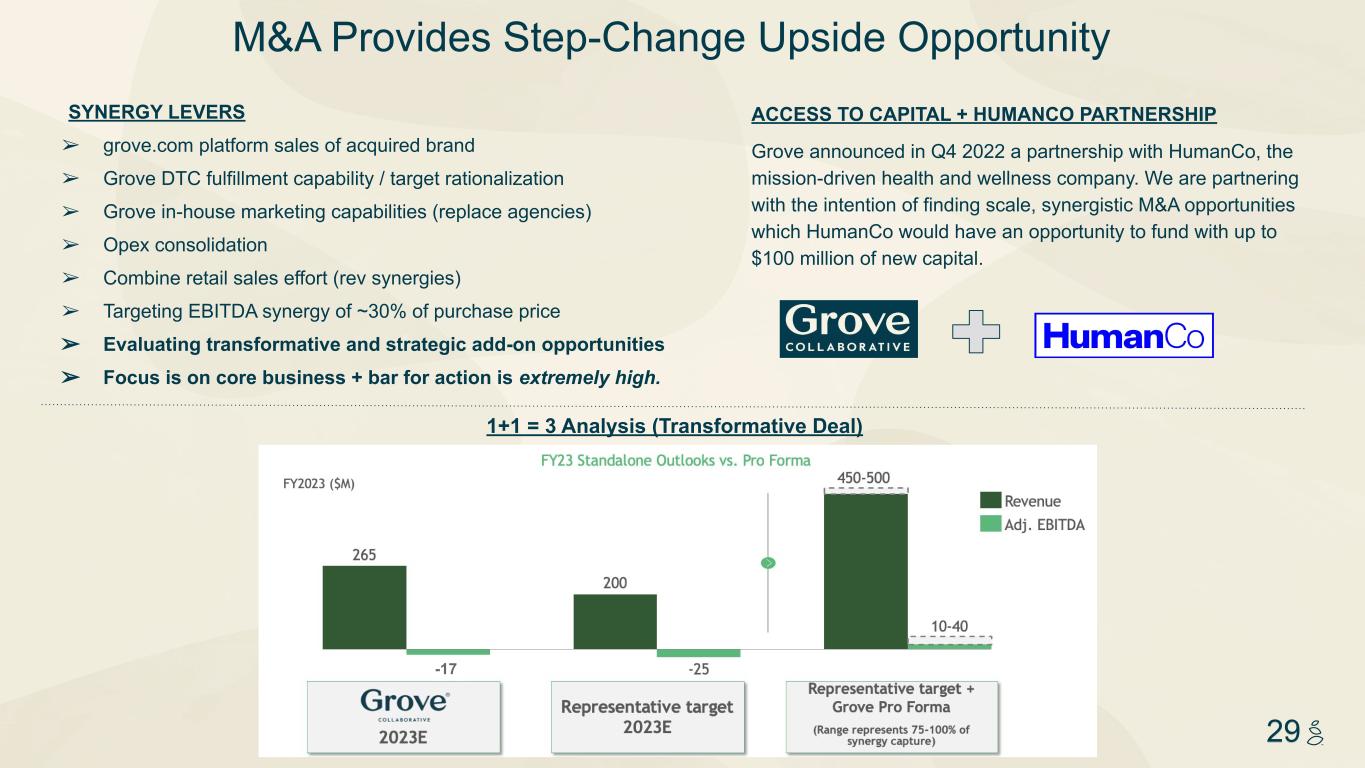NOTES START FROM HERE AND GROW UP NO CONTENT BELOW THIS LINE CONTENT BELOW THIS LINE SUBTITLE BELOW THIS LINE TITLE CAN NOT GO ABOVE THIS LINE 3 59 76 0 114 88 120 159 144 130 186 128 102 163 157 172 196 200 255 255 255 0 0 0 247 243 228 3 59 76 247 243 228 29 SYNERGY LEVERS ➢ grove.com platform sales of acquired brand ➢ Grove DTC fulfillment capability / target rationalization ➢ Grove in-house marketing capabilities (replace agencies) ➢ Opex consolidation ➢ Combine retail sales effort (rev synergies) ➢ Targeting EBITDA synergy of ~30% of purchase price ➢ Evaluating transformative and strategic add-on opportunities ➢ Focus is on core business + bar for action is extremely high. M&A Provides Step-Change Upside Opportunity ACCESS TO CAPITAL + HUMANCO PARTNERSHIP Grove announced in Q4 2022 a partnership with HumanCo, the mission-driven health and wellness company. We are partnering with the intention of finding scale, synergistic M&A opportunities which HumanCo would have an opportunity to fund with up to $100 million of new capital. 1+1 = 3 Analysis (Transformative Deal) -17