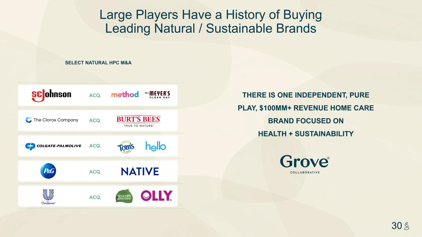 NOTES START FROM HERE AND GROW UP NO CONTENT BELOW THIS LINE CONTENT BELOW THIS LINE SUBTITLE BELOW THIS LINE TITLE CAN NOT GO ABOVE THIS LINE 3 59 76 0 114 88 120 159 144 130 186 128 102 163 157 172 196 200 255 255 255 0 0 0 247 243 228 3 59 76 247 243 228 30 Large Players Have a History of Buying Leading Natural / Sustainable Brands SELECT NATURAL HPC M&A ACQ. ACQ. ACQ. ACQ. ACQ. THERE IS ONE INDEPENDENT, PURE PLAY, $100MM+ REVENUE HOME CARE BRAND FOCUSED ON HEALTH + SUSTAINABILITY