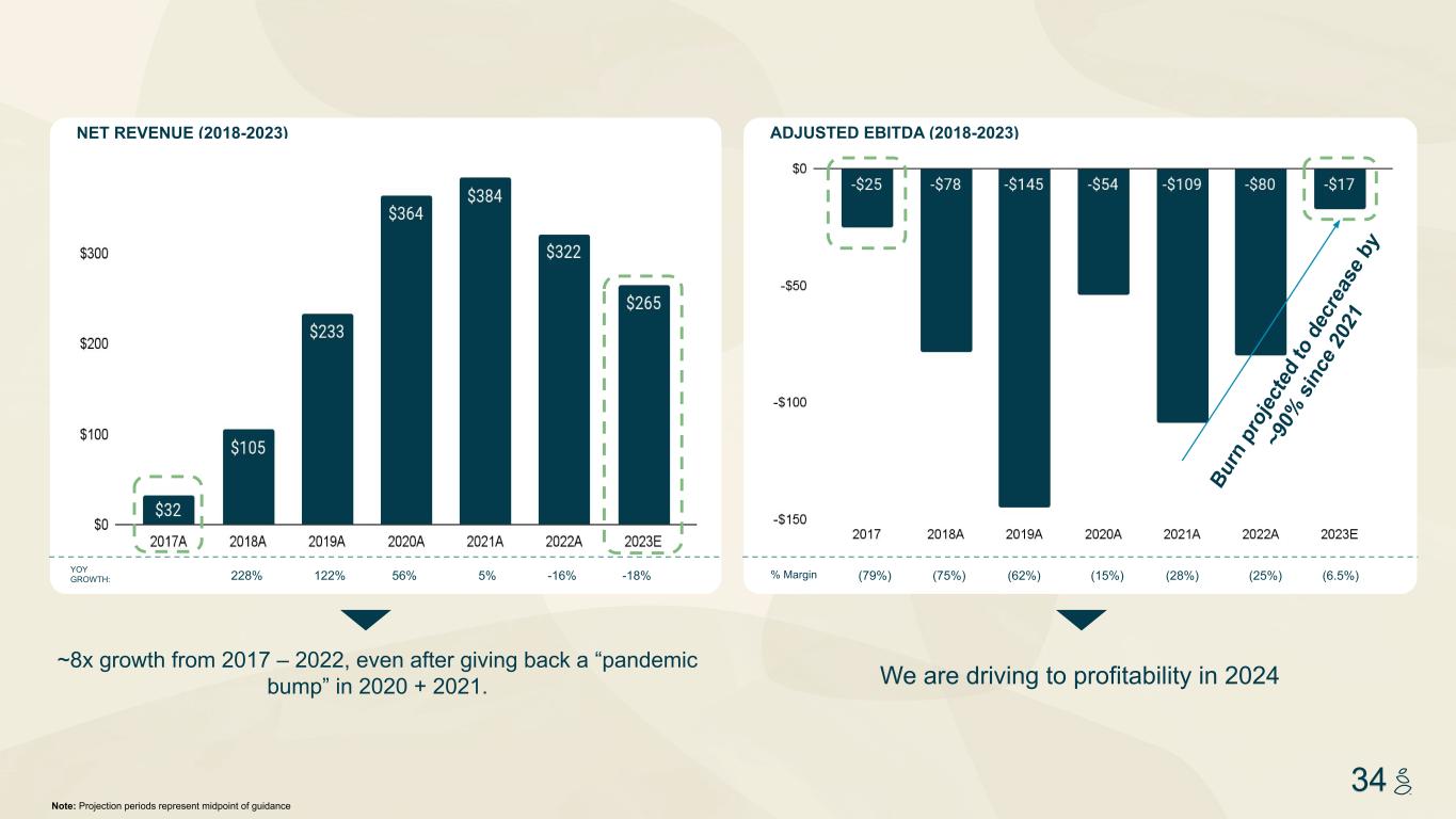 NOTES START FROM HERE AND GROW UP NO CONTENT BELOW THIS LINE CONTENT BELOW THIS LINE SUBTITLE BELOW THIS LINE TITLE CAN NOT GO ABOVE THIS LINE 3 59 76 0 114 88 120 159 144 130 186 128 102 163 157 172 196 200 255 255 255 0 0 0 247 243 228 3 59 76 247 243 228 34 NET REVENUE (2018-2023) ($MM) Note: Projection periods represent midpoint of guidance ~8x growth from 2017 – 2022, even after giving back a “pandemic bump” in 2020 + 2021. ADJUSTED EBITDA (2018-2023) (75%)% Margin (62%) (15%) (28%) (25%) (6.5%) Bu rn p ro je ct ed to d ec re as e by ~9 0% s in ce 2 02 1 We are driving to profitability in 2024 228%YOY GROWTH: 122% 56% 5% -16% -18% (79%)