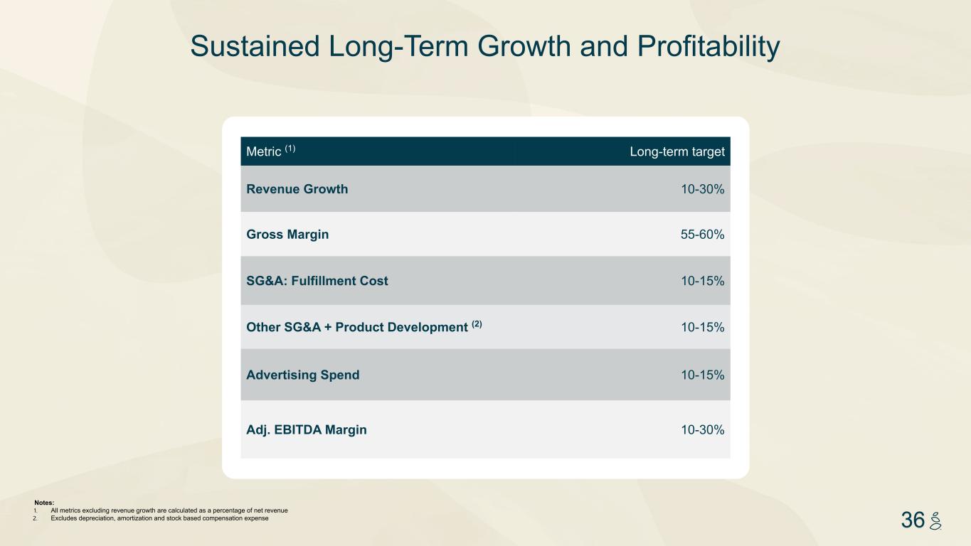 NOTES START FROM HERE AND GROW UP NO CONTENT BELOW THIS LINE CONTENT BELOW THIS LINE SUBTITLE BELOW THIS LINE TITLE CAN NOT GO ABOVE THIS LINE 3 59 76 0 114 88 120 159 144 130 186 128 102 163 157 172 196 200 255 255 255 0 0 0 247 243 228 3 59 76 247 243 228 36 Sustained Long-Term Growth and Profitability Notes: 1. All metrics excluding revenue growth are calculated as a percentage of net revenue 2. Excludes depreciation, amortization and stock based compensation expense Metric (1) Long-term target Revenue Growth 10-30% Gross Margin 55-60% SG&A: Fulfillment Cost 10-15% Other SG&A + Product Development (2) 10-15% Advertising Spend 10-15% Adj. EBITDA Margin 10-30%