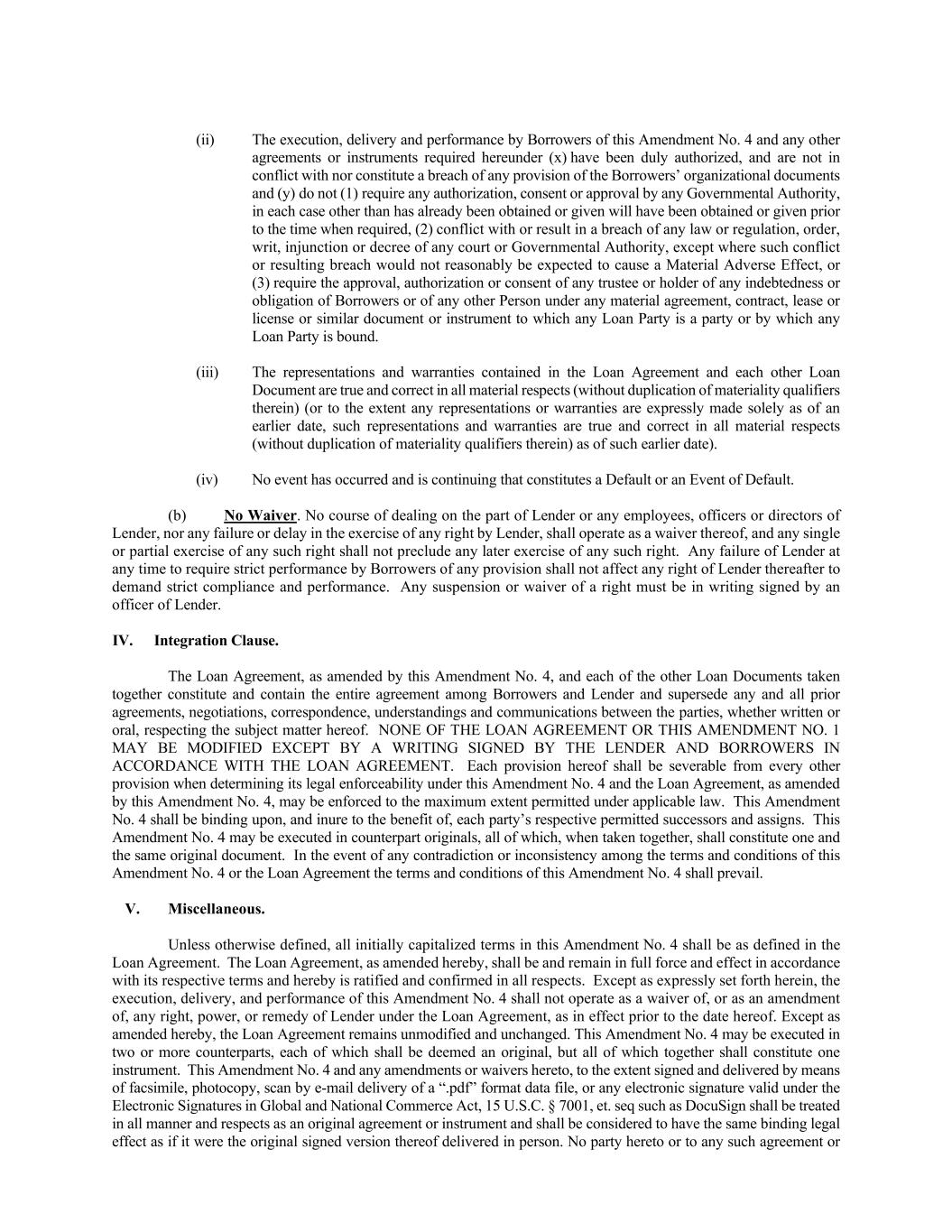 (ii) The execution, delivery and performance by Borrowers of this Amendment No. 4 and any other agreements or instruments required hereunder (x) have been duly authorized, and are not in conflict with nor constitute a breach of any provision of the Borrowers’ organizational documents and (y) do not (1) require any authorization, consent or approval by any Governmental Authority, in each case other than has already been obtained or given will have been obtained or given prior to the time when required, (2) conflict with or result in a breach of any law or regulation, order, writ, injunction or decree of any court or Governmental Authority, except where such conflict or resulting breach would not reasonably be expected to cause a Material Adverse Effect, or (3) require the approval, authorization or consent of any trustee or holder of any indebtedness or obligation of Borrowers or of any other Person under any material agreement, contract, lease or license or similar document or instrument to which any Loan Party is a party or by which any Loan Party is bound. (iii) The representations and warranties contained in the Loan Agreement and each other Loan Document are true and correct in all material respects (without duplication of materiality qualifiers therein) (or to the extent any representations or warranties are expressly made solely as of an earlier date, such representations and warranties are true and correct in all material respects (without duplication of materiality qualifiers therein) as of such earlier date). (iv) No event has occurred and is continuing that constitutes a Default or an Event of Default. (b) No Waiver. No course of dealing on the part of Lender or any employees, officers or directors of Lender, nor any failure or delay in the exercise of any right by Lender, shall operate as a waiver thereof, and any single or partial exercise of any such right shall not preclude any later exercise of any such right. Any failure of Lender at any time to require strict performance by Borrowers of any provision shall not affect any right of Lender thereafter to demand strict compliance and performance. Any suspension or waiver of a right must be in writing signed by an officer of Lender. IV. Integration Clause. The Loan Agreement, as amended by this Amendment No. 4, and each of the other Loan Documents taken together constitute and contain the entire agreement among Borrowers and Lender and supersede any and all prior agreements, negotiations, correspondence, understandings and communications between the parties, whether written or oral, respecting the subject matter hereof. NONE OF THE LOAN AGREEMENT OR THIS AMENDMENT NO. 1 MAY BE MODIFIED EXCEPT BY A WRITING SIGNED BY THE LENDER AND BORROWERS IN ACCORDANCE WITH THE LOAN AGREEMENT. Each provision hereof shall be severable from every other provision when determining its legal enforceability under this Amendment No. 4 and the Loan Agreement, as amended by this Amendment No. 4, may be enforced to the maximum extent permitted under applicable law. This Amendment No. 4 shall be binding upon, and inure to the benefit of, each party’s respective permitted successors and assigns. This Amendment No. 4 may be executed in counterpart originals, all of which, when taken together, shall constitute one and the same original document. In the event of any contradiction or inconsistency among the terms and conditions of this Amendment No. 4 or the Loan Agreement the terms and conditions of this Amendment No. 4 shall prevail. V. Miscellaneous. Unless otherwise defined, all initially capitalized terms in this Amendment No. 4 shall be as defined in the Loan Agreement. The Loan Agreement, as amended hereby, shall be and remain in full force and effect in accordance with its respective terms and hereby is ratified and confirmed in all respects. Except as expressly set forth herein, the execution, delivery, and performance of this Amendment No. 4 shall not operate as a waiver of, or as an amendment of, any right, power, or remedy of Lender under the Loan Agreement, as in effect prior to the date hereof. Except as amended hereby, the Loan Agreement remains unmodified and unchanged. This Amendment No. 4 may be executed in two or more counterparts, each of which shall be deemed an original, but all of which together shall constitute one instrument. This Amendment No. 4 and any amendments or waivers hereto, to the extent signed and delivered by means of facsimile, photocopy, scan by e-mail delivery of a “.pdf” format data file, or any electronic signature valid under the Electronic Signatures in Global and National Commerce Act, 15 U.S.C. § 7001, et. seq such as DocuSign shall be treated in all manner and respects as an original agreement or instrument and shall be considered to have the same binding legal effect as if it were the original signed version thereof delivered in person. No party hereto or to any such agreement or