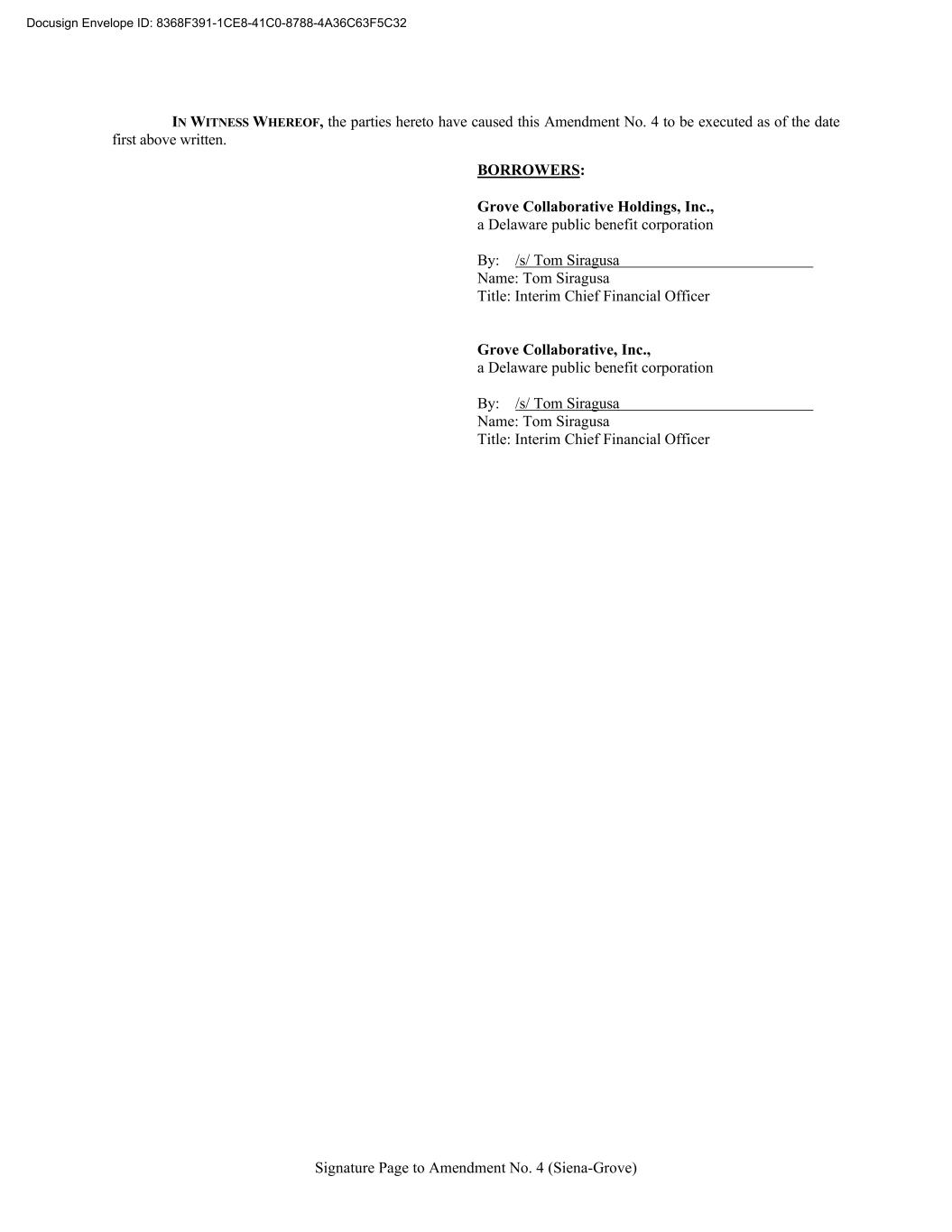 Signature Page to Amendment No. 4 (Siena-Grove) IN WITNESS WHEREOF, the parties hereto have caused this Amendment No. 4 to be executed as of the date first above written. BORROWERS: Grove Collaborative Holdings, Inc., a Delaware public benefit corporation By: /s/ Tom Siragusa Name: Tom Siragusa Title: Interim Chief Financial Officer Grove Collaborative, Inc., a Delaware public benefit corporation By: /s/ Tom Siragusa Name: Tom Siragusa Title: Interim Chief Financial Officer Docusign Envelope ID: 8368F391-1CE8-41C0-8788-4A36C63F5C32