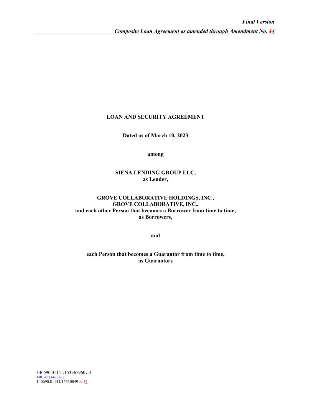 Final Version Composite Loan Agreement as amended through Amendment No. 34 LOAN AND SECURITY AGREEMENT Dated as of March 10, 2023 among SIENA LENDING GROUP LLC, as Lender, GROVE COLLABORATIVE HOLDINGS, INC., GROVE COLLABORATIVE, INC., and each other Person that becomes a Borrower from time to time, as Borrowers, and each Person that becomes a Guarantor from time to time, as Guarantors 140690.01141/153967960v.3 4903-4313-6361v.2 140690.01141/155300491v.14