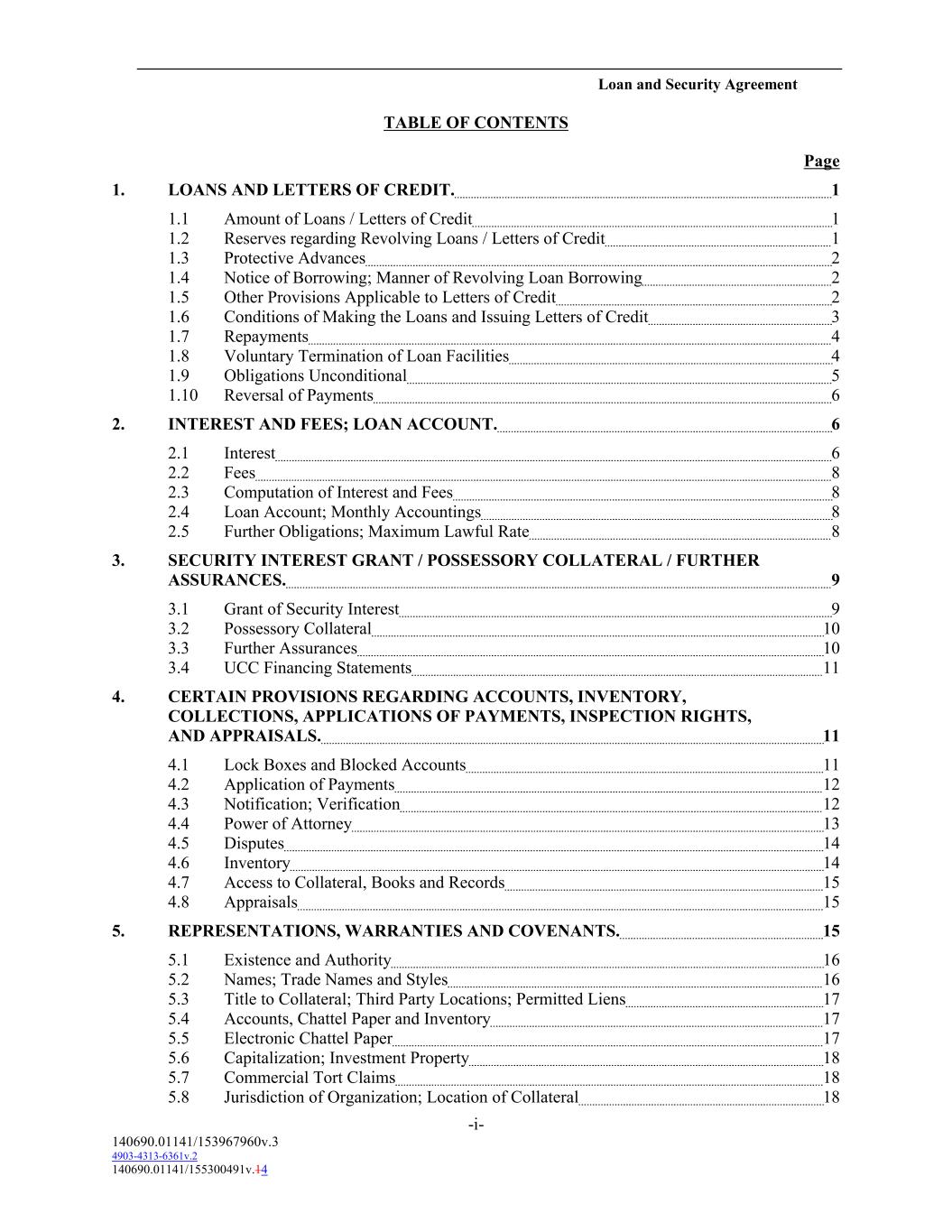 Loan and Security Agreement TABLE OF CONTENTS Page 1. LOANS AND LETTERS OF CREDIT. 1 1.1 Amount of Loans / Letters of Credit 1 1.2 Reserves regarding Revolving Loans / Letters of Credit 1 1.3 Protective Advances 2 1.4 Notice of Borrowing; Manner of Revolving Loan Borrowing 2 1.5 Other Provisions Applicable to Letters of Credit 2 1.6 Conditions of Making the Loans and Issuing Letters of Credit 3 1.7 Repayments 4 1.8 Voluntary Termination of Loan Facilities 4 1.9 Obligations Unconditional 5 1.10 Reversal of Payments 6 2. INTEREST AND FEES; LOAN ACCOUNT. 6 2.1 Interest 6 2.2 Fees 8 2.3 Computation of Interest and Fees 8 2.4 Loan Account; Monthly Accountings 8 2.5 Further Obligations; Maximum Lawful Rate 8 3. SECURITY INTEREST GRANT / POSSESSORY COLLATERAL / FURTHER ASSURANCES. 9 3.1 Grant of Security Interest 9 3.2 Possessory Collateral 10 3.3 Further Assurances 10 3.4 UCC Financing Statements 11 4. CERTAIN PROVISIONS REGARDING ACCOUNTS, INVENTORY, COLLECTIONS, APPLICATIONS OF PAYMENTS, INSPECTION RIGHTS, AND APPRAISALS. 11 4.1 Lock Boxes and Blocked Accounts 11 4.2 Application of Payments 12 4.3 Notification; Verification 12 4.4 Power of Attorney 13 4.5 Disputes 14 4.6 Inventory 14 4.7 Access to Collateral, Books and Records 15 4.8 Appraisals 15 5. REPRESENTATIONS, WARRANTIES AND COVENANTS. 15 5.1 Existence and Authority 16 5.2 Names; Trade Names and Styles 16 5.3 Title to Collateral; Third Party Locations; Permitted Liens 17 5.4 Accounts, Chattel Paper and Inventory 17 5.5 Electronic Chattel Paper 17 5.6 Capitalization; Investment Property 18 5.7 Commercial Tort Claims 18 5.8 Jurisdiction of Organization; Location of Collateral 18 -i- 140690.01141/153967960v.3 4903-4313-6361v.2 140690.01141/155300491v.14