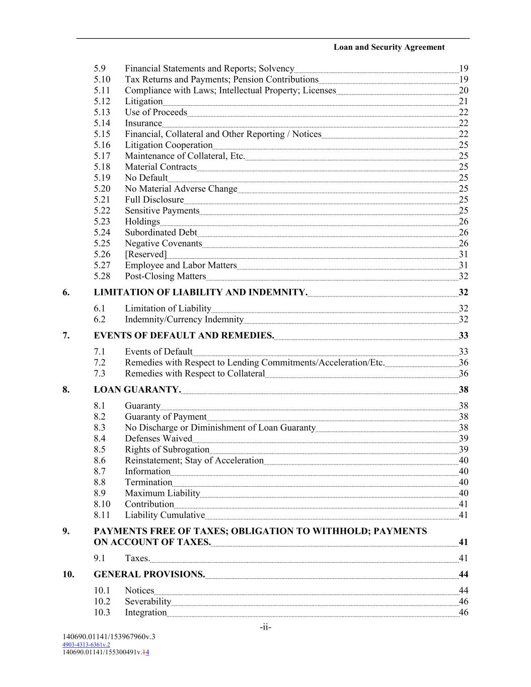 Loan and Security Agreement 5.9 Financial Statements and Reports; Solvency 19 5.10 Tax Returns and Payments; Pension Contributions 19 5.11 Compliance with Laws; Intellectual Property; Licenses 20 5.12 Litigation 21 5.13 Use of Proceeds 22 5.14 Insurance 22 5.15 Financial, Collateral and Other Reporting / Notices 22 5.16 Litigation Cooperation 25 5.17 Maintenance of Collateral, Etc. 25 5.18 Material Contracts 25 5.19 No Default 25 5.20 No Material Adverse Change 25 5.21 Full Disclosure 25 5.22 Sensitive Payments 25 5.23 Holdings 26 5.24 Subordinated Debt 26 5.25 Negative Covenants 26 5.26 [Reserved] 31 5.27 Employee and Labor Matters 31 5.28 Post-Closing Matters 32 6. LIMITATION OF LIABILITY AND INDEMNITY. 32 6.1 Limitation of Liability 32 6.2 Indemnity/Currency Indemnity 32 7. EVENTS OF DEFAULT AND REMEDIES. 33 7.1 Events of Default 33 7.2 Remedies with Respect to Lending Commitments/Acceleration/Etc. 36 7.3 Remedies with Respect to Collateral 36 8. LOAN GUARANTY. 38 8.1 Guaranty 38 8.2 Guaranty of Payment 38 8.3 No Discharge or Diminishment of Loan Guaranty 38 8.4 Defenses Waived 39 8.5 Rights of Subrogation 39 8.6 Reinstatement; Stay of Acceleration 40 8.7 Information 40 8.8 Termination 40 8.9 Maximum Liability 40 8.10 Contribution 41 8.11 Liability Cumulative 41 9. PAYMENTS FREE OF TAXES; OBLIGATION TO WITHHOLD; PAYMENTS ON ACCOUNT OF TAXES. 41 9.1 Taxes. 41 10. GENERAL PROVISIONS. 44 10.1 Notices 44 10.2 Severability 46 10.3 Integration 46 -ii- 140690.01141/153967960v.3 4903-4313-6361v.2 140690.01141/155300491v.14