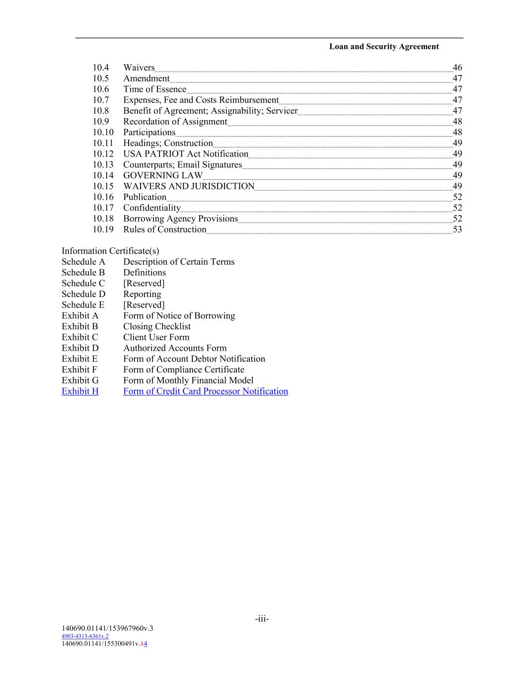 Loan and Security Agreement 10.4 Waivers 46 10.5 Amendment 47 10.6 Time of Essence 47 10.7 Expenses, Fee and Costs Reimbursement 47 10.8 Benefit of Agreement; Assignability; Servicer 47 10.9 Recordation of Assignment 48 10.10 Participations 48 10.11 Headings; Construction 49 10.12 USA PATRIOT Act Notification 49 10.13 Counterparts; Email Signatures 49 10.14 GOVERNING LAW 49 10.15 WAIVERS AND JURISDICTION 49 10.16 Publication 52 10.17 Confidentiality 52 10.18 Borrowing Agency Provisions 52 10.19 Rules of Construction 53 Information Certificate(s) Schedule A Description of Certain Terms Schedule B Definitions Schedule C [Reserved] Schedule D Reporting Schedule E [Reserved] Exhibit A Form of Notice of Borrowing Exhibit B Closing Checklist Exhibit C Client User Form Exhibit D Authorized Accounts Form Exhibit E Form of Account Debtor Notification Exhibit F Form of Compliance Certificate Exhibit G Form of Monthly Financial Model Exhibit H Form of Credit Card Processor Notification -iii- 140690.01141/153967960v.3 4903-4313-6361v.2 140690.01141/155300491v.14