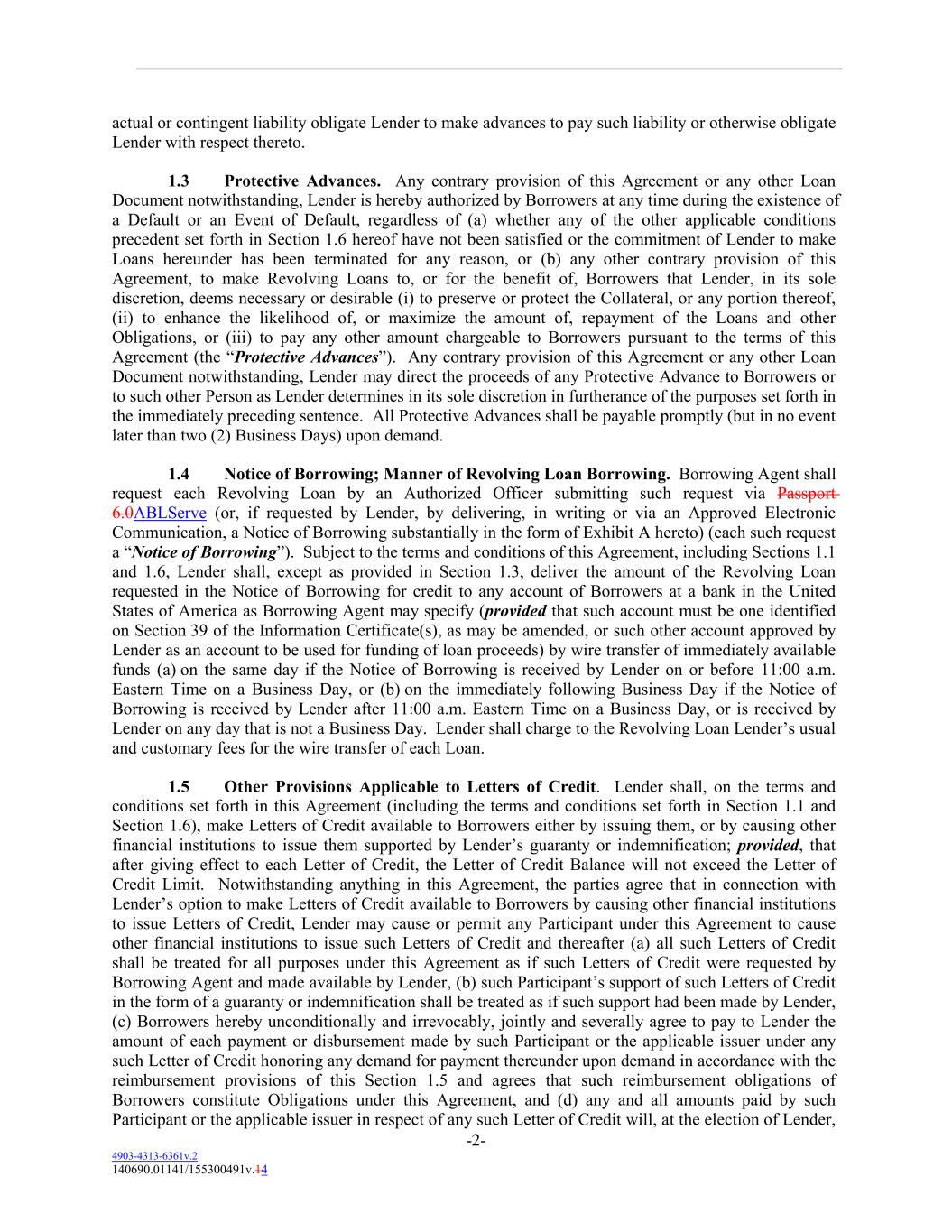 actual or contingent liability obligate Lender to make advances to pay such liability or otherwise obligate Lender with respect thereto. 1.3 Protective Advances. Any contrary provision of this Agreement or any other Loan Document notwithstanding, Lender is hereby authorized by Borrowers at any time during the existence of a Default or an Event of Default, regardless of (a) whether any of the other applicable conditions precedent set forth in Section 1.6 hereof have not been satisfied or the commitment of Lender to make Loans hereunder has been terminated for any reason, or (b) any other contrary provision of this Agreement, to make Revolving Loans to, or for the benefit of, Borrowers that Lender, in its sole discretion, deems necessary or desirable (i) to preserve or protect the Collateral, or any portion thereof, (ii) to enhance the likelihood of, or maximize the amount of, repayment of the Loans and other Obligations, or (iii) to pay any other amount chargeable to Borrowers pursuant to the terms of this Agreement (the “Protective Advances”). Any contrary provision of this Agreement or any other Loan Document notwithstanding, Lender may direct the proceeds of any Protective Advance to Borrowers or to such other Person as Lender determines in its sole discretion in furtherance of the purposes set forth in the immediately preceding sentence. All Protective Advances shall be payable promptly (but in no event later than two (2) Business Days) upon demand. 1.4 Notice of Borrowing; Manner of Revolving Loan Borrowing. Borrowing Agent shall request each Revolving Loan by an Authorized Officer submitting such request via Passport 6.0ABLServe (or, if requested by Lender, by delivering, in writing or via an Approved Electronic Communication, a Notice of Borrowing substantially in the form of Exhibit A hereto) (each such request a “Notice of Borrowing”). Subject to the terms and conditions of this Agreement, including Sections 1.1 and 1.6, Lender shall, except as provided in Section 1.3, deliver the amount of the Revolving Loan requested in the Notice of Borrowing for credit to any account of Borrowers at a bank in the United States of America as Borrowing Agent may specify (provided that such account must be one identified on Section 39 of the Information Certificate(s), as may be amended, or such other account approved by Lender as an account to be used for funding of loan proceeds) by wire transfer of immediately available funds (a) on the same day if the Notice of Borrowing is received by Lender on or before 11:00 a.m. Eastern Time on a Business Day, or (b) on the immediately following Business Day if the Notice of Borrowing is received by Lender after 11:00 a.m. Eastern Time on a Business Day, or is received by Lender on any day that is not a Business Day. Lender shall charge to the Revolving Loan Lender’s usual and customary fees for the wire transfer of each Loan. 1.5 Other Provisions Applicable to Letters of Credit. Lender shall, on the terms and conditions set forth in this Agreement (including the terms and conditions set forth in Section 1.1 and Section 1.6), make Letters of Credit available to Borrowers either by issuing them, or by causing other financial institutions to issue them supported by Lender’s guaranty or indemnification; provided, that after giving effect to each Letter of Credit, the Letter of Credit Balance will not exceed the Letter of Credit Limit. Notwithstanding anything in this Agreement, the parties agree that in connection with Lender’s option to make Letters of Credit available to Borrowers by causing other financial institutions to issue Letters of Credit, Lender may cause or permit any Participant under this Agreement to cause other financial institutions to issue such Letters of Credit and thereafter (a) all such Letters of Credit shall be treated for all purposes under this Agreement as if such Letters of Credit were requested by Borrowing Agent and made available by Lender, (b) such Participant’s support of such Letters of Credit in the form of a guaranty or indemnification shall be treated as if such support had been made by Lender, (c) Borrowers hereby unconditionally and irrevocably, jointly and severally agree to pay to Lender the amount of each payment or disbursement made by such Participant or the applicable issuer under any such Letter of Credit honoring any demand for payment thereunder upon demand in accordance with the reimbursement provisions of this Section 1.5 and agrees that such reimbursement obligations of Borrowers constitute Obligations under this Agreement, and (d) any and all amounts paid by such Participant or the applicable issuer in respect of any such Letter of Credit will, at the election of Lender, -2- 4903-4313-6361v.2 140690.01141/155300491v.14