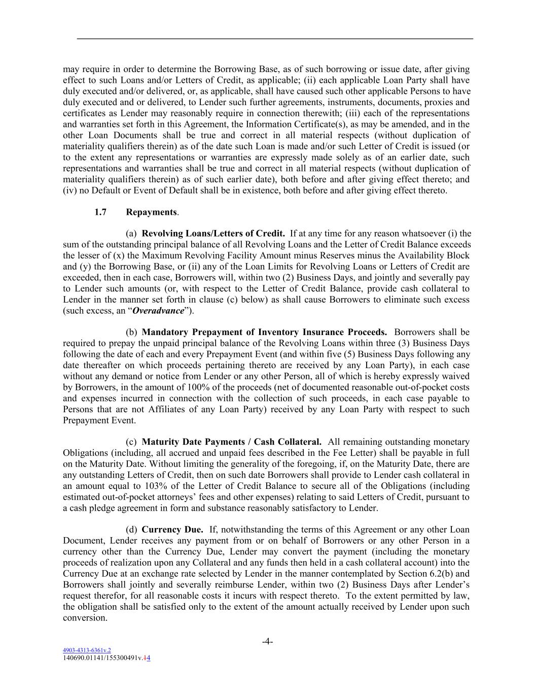 may require in order to determine the Borrowing Base, as of such borrowing or issue date, after giving effect to such Loans and/or Letters of Credit, as applicable; (ii) each applicable Loan Party shall have duly executed and/or delivered, or, as applicable, shall have caused such other applicable Persons to have duly executed and or delivered, to Lender such further agreements, instruments, documents, proxies and certificates as Lender may reasonably require in connection therewith; (iii) each of the representations and warranties set forth in this Agreement, the Information Certificate(s), as may be amended, and in the other Loan Documents shall be true and correct in all material respects (without duplication of materiality qualifiers therein) as of the date such Loan is made and/or such Letter of Credit is issued (or to the extent any representations or warranties are expressly made solely as of an earlier date, such representations and warranties shall be true and correct in all material respects (without duplication of materiality qualifiers therein) as of such earlier date), both before and after giving effect thereto; and (iv) no Default or Event of Default shall be in existence, both before and after giving effect thereto. 1.7 Repayments. (a) Revolving Loans/Letters of Credit. If at any time for any reason whatsoever (i) the sum of the outstanding principal balance of all Revolving Loans and the Letter of Credit Balance exceeds the lesser of (x) the Maximum Revolving Facility Amount minus Reserves minus the Availability Block and (y) the Borrowing Base, or (ii) any of the Loan Limits for Revolving Loans or Letters of Credit are exceeded, then in each case, Borrowers will, within two (2) Business Days, and jointly and severally pay to Lender such amounts (or, with respect to the Letter of Credit Balance, provide cash collateral to Lender in the manner set forth in clause (c) below) as shall cause Borrowers to eliminate such excess (such excess, an “Overadvance”). (b) Mandatory Prepayment of Inventory Insurance Proceeds. Borrowers shall be required to prepay the unpaid principal balance of the Revolving Loans within three (3) Business Days following the date of each and every Prepayment Event (and within five (5) Business Days following any date thereafter on which proceeds pertaining thereto are received by any Loan Party), in each case without any demand or notice from Lender or any other Person, all of which is hereby expressly waived by Borrowers, in the amount of 100% of the proceeds (net of documented reasonable out-of-pocket costs and expenses incurred in connection with the collection of such proceeds, in each case payable to Persons that are not Affiliates of any Loan Party) received by any Loan Party with respect to such Prepayment Event. (c) Maturity Date Payments / Cash Collateral. All remaining outstanding monetary Obligations (including, all accrued and unpaid fees described in the Fee Letter) shall be payable in full on the Maturity Date. Without limiting the generality of the foregoing, if, on the Maturity Date, there are any outstanding Letters of Credit, then on such date Borrowers shall provide to Lender cash collateral in an amount equal to 103% of the Letter of Credit Balance to secure all of the Obligations (including estimated out-of-pocket attorneys’ fees and other expenses) relating to said Letters of Credit, pursuant to a cash pledge agreement in form and substance reasonably satisfactory to Lender. (d) Currency Due. If, notwithstanding the terms of this Agreement or any other Loan Document, Lender receives any payment from or on behalf of Borrowers or any other Person in a currency other than the Currency Due, Lender may convert the payment (including the monetary proceeds of realization upon any Collateral and any funds then held in a cash collateral account) into the Currency Due at an exchange rate selected by Lender in the manner contemplated by Section 6.2(b) and Borrowers shall jointly and severally reimburse Lender, within two (2) Business Days after Lender’s request therefor, for all reasonable costs it incurs with respect thereto. To the extent permitted by law, the obligation shall be satisfied only to the extent of the amount actually received by Lender upon such conversion. -4- 4903-4313-6361v.2 140690.01141/155300491v.14