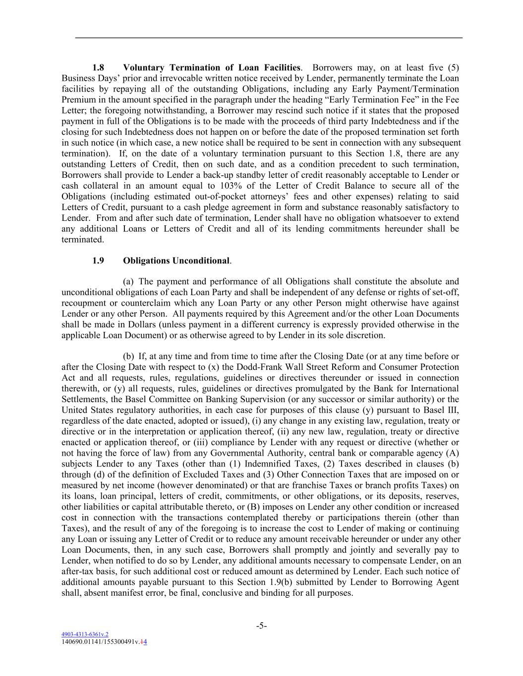 1.8 Voluntary Termination of Loan Facilities. Borrowers may, on at least five (5) Business Days’ prior and irrevocable written notice received by Lender, permanently terminate the Loan facilities by repaying all of the outstanding Obligations, including any Early Payment/Termination Premium in the amount specified in the paragraph under the heading “Early Termination Fee” in the Fee Letter; the foregoing notwithstanding, a Borrower may rescind such notice if it states that the proposed payment in full of the Obligations is to be made with the proceeds of third party Indebtedness and if the closing for such Indebtedness does not happen on or before the date of the proposed termination set forth in such notice (in which case, a new notice shall be required to be sent in connection with any subsequent termination). If, on the date of a voluntary termination pursuant to this Section 1.8, there are any outstanding Letters of Credit, then on such date, and as a condition precedent to such termination, Borrowers shall provide to Lender a back-up standby letter of credit reasonably acceptable to Lender or cash collateral in an amount equal to 103% of the Letter of Credit Balance to secure all of the Obligations (including estimated out-of-pocket attorneys’ fees and other expenses) relating to said Letters of Credit, pursuant to a cash pledge agreement in form and substance reasonably satisfactory to Lender. From and after such date of termination, Lender shall have no obligation whatsoever to extend any additional Loans or Letters of Credit and all of its lending commitments hereunder shall be terminated. 1.9 Obligations Unconditional. (a) The payment and performance of all Obligations shall constitute the absolute and unconditional obligations of each Loan Party and shall be independent of any defense or rights of set-off, recoupment or counterclaim which any Loan Party or any other Person might otherwise have against Lender or any other Person. All payments required by this Agreement and/or the other Loan Documents shall be made in Dollars (unless payment in a different currency is expressly provided otherwise in the applicable Loan Document) or as otherwise agreed to by Lender in its sole discretion. (b) If, at any time and from time to time after the Closing Date (or at any time before or after the Closing Date with respect to (x) the Dodd-Frank Wall Street Reform and Consumer Protection Act and all requests, rules, regulations, guidelines or directives thereunder or issued in connection therewith, or (y) all requests, rules, guidelines or directives promulgated by the Bank for International Settlements, the Basel Committee on Banking Supervision (or any successor or similar authority) or the United States regulatory authorities, in each case for purposes of this clause (y) pursuant to Basel III, regardless of the date enacted, adopted or issued), (i) any change in any existing law, regulation, treaty or directive or in the interpretation or application thereof, (ii) any new law, regulation, treaty or directive enacted or application thereof, or (iii) compliance by Lender with any request or directive (whether or not having the force of law) from any Governmental Authority, central bank or comparable agency (A) subjects Lender to any Taxes (other than (1) Indemnified Taxes, (2) Taxes described in clauses (b) through (d) of the definition of Excluded Taxes and (3) Other Connection Taxes that are imposed on or measured by net income (however denominated) or that are franchise Taxes or branch profits Taxes) on its loans, loan principal, letters of credit, commitments, or other obligations, or its deposits, reserves, other liabilities or capital attributable thereto, or (B) imposes on Lender any other condition or increased cost in connection with the transactions contemplated thereby or participations therein (other than Taxes), and the result of any of the foregoing is to increase the cost to Lender of making or continuing any Loan or issuing any Letter of Credit or to reduce any amount receivable hereunder or under any other Loan Documents, then, in any such case, Borrowers shall promptly and jointly and severally pay to Lender, when notified to do so by Lender, any additional amounts necessary to compensate Lender, on an after-tax basis, for such additional cost or reduced amount as determined by Lender. Each such notice of additional amounts payable pursuant to this Section 1.9(b) submitted by Lender to Borrowing Agent shall, absent manifest error, be final, conclusive and binding for all purposes. -5- 4903-4313-6361v.2 140690.01141/155300491v.14