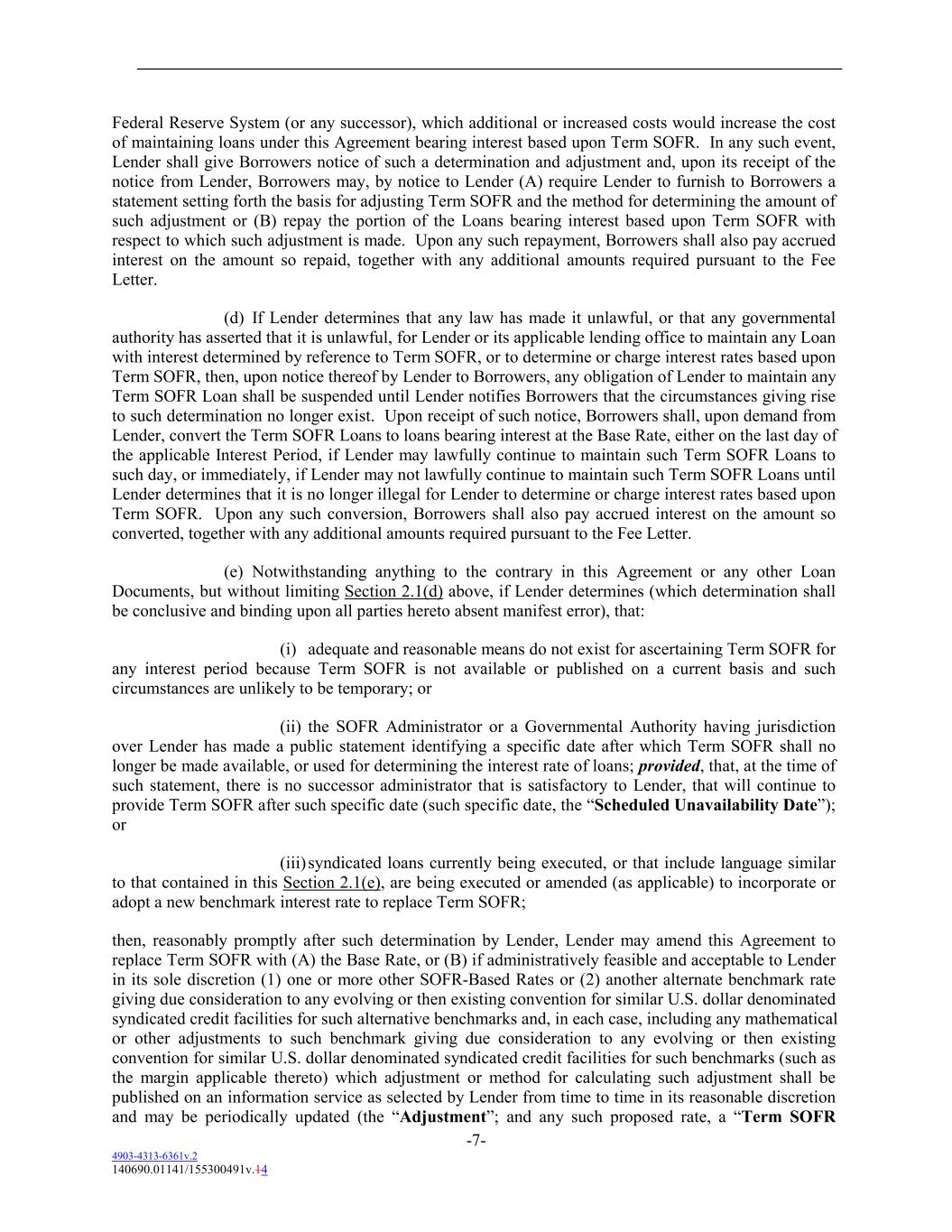 Federal Reserve System (or any successor), which additional or increased costs would increase the cost of maintaining loans under this Agreement bearing interest based upon Term SOFR. In any such event, Lender shall give Borrowers notice of such a determination and adjustment and, upon its receipt of the notice from Lender, Borrowers may, by notice to Lender (A) require Lender to furnish to Borrowers a statement setting forth the basis for adjusting Term SOFR and the method for determining the amount of such adjustment or (B) repay the portion of the Loans bearing interest based upon Term SOFR with respect to which such adjustment is made. Upon any such repayment, Borrowers shall also pay accrued interest on the amount so repaid, together with any additional amounts required pursuant to the Fee Letter. (d) If Lender determines that any law has made it unlawful, or that any governmental authority has asserted that it is unlawful, for Lender or its applicable lending office to maintain any Loan with interest determined by reference to Term SOFR, or to determine or charge interest rates based upon Term SOFR, then, upon notice thereof by Lender to Borrowers, any obligation of Lender to maintain any Term SOFR Loan shall be suspended until Lender notifies Borrowers that the circumstances giving rise to such determination no longer exist. Upon receipt of such notice, Borrowers shall, upon demand from Lender, convert the Term SOFR Loans to loans bearing interest at the Base Rate, either on the last day of the applicable Interest Period, if Lender may lawfully continue to maintain such Term SOFR Loans to such day, or immediately, if Lender may not lawfully continue to maintain such Term SOFR Loans until Lender determines that it is no longer illegal for Lender to determine or charge interest rates based upon Term SOFR. Upon any such conversion, Borrowers shall also pay accrued interest on the amount so converted, together with any additional amounts required pursuant to the Fee Letter. (e) Notwithstanding anything to the contrary in this Agreement or any other Loan Documents, but without limiting Section 2.1(d) above, if Lender determines (which determination shall be conclusive and binding upon all parties hereto absent manifest error), that: (i) adequate and reasonable means do not exist for ascertaining Term SOFR for any interest period because Term SOFR is not available or published on a current basis and such circumstances are unlikely to be temporary; or (ii) the SOFR Administrator or a Governmental Authority having jurisdiction over Lender has made a public statement identifying a specific date after which Term SOFR shall no longer be made available, or used for determining the interest rate of loans; provided, that, at the time of such statement, there is no successor administrator that is satisfactory to Lender, that will continue to provide Term SOFR after such specific date (such specific date, the “Scheduled Unavailability Date”); or (iii) syndicated loans currently being executed, or that include language similar to that contained in this Section 2.1(e), are being executed or amended (as applicable) to incorporate or adopt a new benchmark interest rate to replace Term SOFR; then, reasonably promptly after such determination by Lender, Lender may amend this Agreement to replace Term SOFR with (A) the Base Rate, or (B) if administratively feasible and acceptable to Lender in its sole discretion (1) one or more other SOFR-Based Rates or (2) another alternate benchmark rate giving due consideration to any evolving or then existing convention for similar U.S. dollar denominated syndicated credit facilities for such alternative benchmarks and, in each case, including any mathematical or other adjustments to such benchmark giving due consideration to any evolving or then existing convention for similar U.S. dollar denominated syndicated credit facilities for such benchmarks (such as the margin applicable thereto) which adjustment or method for calculating such adjustment shall be published on an information service as selected by Lender from time to time in its reasonable discretion and may be periodically updated (the “Adjustment”; and any such proposed rate, a “Term SOFR -7- 4903-4313-6361v.2 140690.01141/155300491v.14
