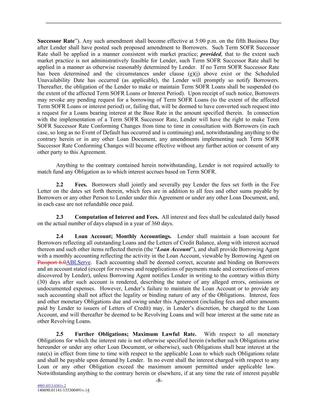 Successor Rate”). Any such amendment shall become effective at 5:00 p.m. on the fifth Business Day after Lender shall have posted such proposed amendment to Borrowers. Such Term SOFR Successor Rate shall be applied in a manner consistent with market practice; provided, that to the extent such market practice is not administratively feasible for Lender, such Term SOFR Successor Rate shall be applied in a manner as otherwise reasonably determined by Lender. If no Term SOFR Successor Rate has been determined and the circumstances under clause (e)(i) above exist or the Scheduled Unavailability Date has occurred (as applicable), the Lender will promptly so notify Borrowers. Thereafter, the obligation of the Lender to make or maintain Term SOFR Loans shall be suspended (to the extent of the affected Term SOFR Loans or Interest Period). Upon receipt of such notice, Borrowers may revoke any pending request for a borrowing of Term SOFR Loans (to the extent of the affected Term SOFR Loans or interest period) or, failing that, will be deemed to have converted such request into a request for a Loans bearing interest at the Base Rate in the amount specified therein. In connection with the implementation of a Term SOFR Successor Rate, Lender will have the right to make Term SOFR Successor Rate Conforming Changes from time to time in consultation with Borrowers (in each case, so long as no Event of Default has occurred and is continuing) and, notwithstanding anything to the contrary herein or in any other Loan Document, any amendments implementing such Term SOFR Successor Rate Conforming Changes will become effective without any further action or consent of any other party to this Agreement. Anything to the contrary contained herein notwithstanding, Lender is not required actually to match fund any Obligation as to which interest accrues based on Term SOFR. 2.2 Fees. Borrowers shall jointly and severally pay Lender the fees set forth in the Fee Letter on the dates set forth therein, which fees are in addition to all fees and other sums payable by Borrowers or any other Person to Lender under this Agreement or under any other Loan Document, and, in each case are not refundable once paid. 2.3 Computation of Interest and Fees. All interest and fees shall be calculated daily based on the actual number of days elapsed in a year of 360 days. 2.4 Loan Account; Monthly Accountings. Lender shall maintain a loan account for Borrowers reflecting all outstanding Loans and the Letters of Credit Balance, along with interest accrued thereon and such other items reflected therein (the “Loan Account”), and shall provide Borrowing Agent with a monthly accounting reflecting the activity in the Loan Account, viewable by Borrowing Agent on Passport 6.0ABLServe. Each accounting shall be deemed correct, accurate and binding on Borrowers and an account stated (except for reverses and reapplications of payments made and corrections of errors discovered by Lender), unless Borrowing Agent notifies Lender in writing to the contrary within thirty (30) days after such account is rendered, describing the nature of any alleged errors, omissions or undocumented expenses. However, Lender’s failure to maintain the Loan Account or to provide any such accounting shall not affect the legality or binding nature of any of the Obligations. Interest, fees and other monetary Obligations due and owing under this Agreement (including fees and other amounts paid by Lender to issuers of Letters of Credit) may, in Lender’s discretion, be charged to the Loan Account, and will thereafter be deemed to be Revolving Loans and will bear interest at the same rate as other Revolving Loans. 2.5 Further Obligations; Maximum Lawful Rate. With respect to all monetary Obligations for which the interest rate is not otherwise specified herein (whether such Obligations arise hereunder or under any other Loan Document, or otherwise), such Obligations shall bear interest at the rate(s) in effect from time to time with respect to the applicable Loan to which such Obligations relate and shall be payable upon demand by Lender. In no event shall the interest charged with respect to any Loan or any other Obligation exceed the maximum amount permitted under applicable law. Notwithstanding anything to the contrary herein or elsewhere, if at any time the rate of interest payable -8- 4903-4313-6361v.2 140690.01141/155300491v.14