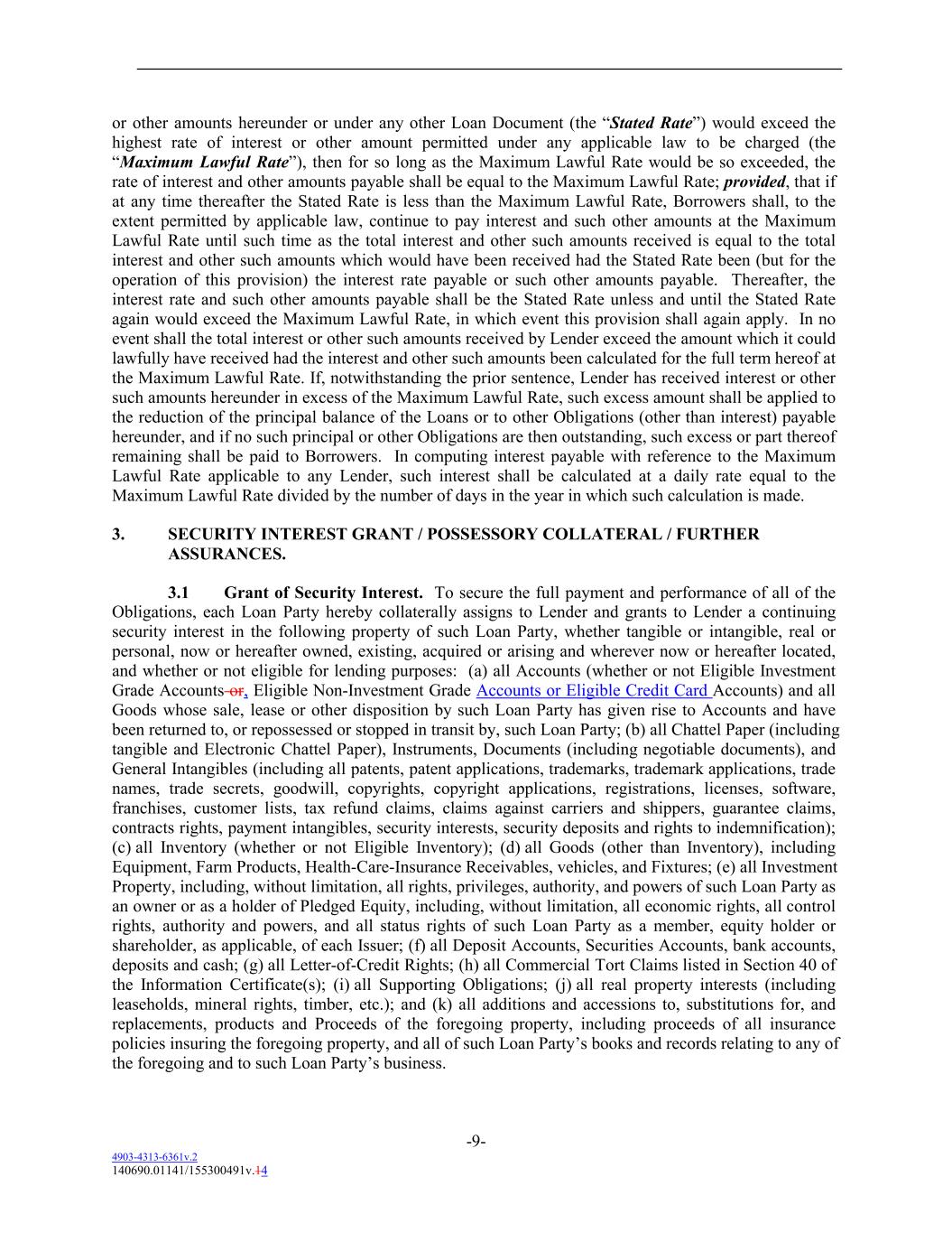 or other amounts hereunder or under any other Loan Document (the “Stated Rate”) would exceed the highest rate of interest or other amount permitted under any applicable law to be charged (the “Maximum Lawful Rate”), then for so long as the Maximum Lawful Rate would be so exceeded, the rate of interest and other amounts payable shall be equal to the Maximum Lawful Rate; provided, that if at any time thereafter the Stated Rate is less than the Maximum Lawful Rate, Borrowers shall, to the extent permitted by applicable law, continue to pay interest and such other amounts at the Maximum Lawful Rate until such time as the total interest and other such amounts received is equal to the total interest and other such amounts which would have been received had the Stated Rate been (but for the operation of this provision) the interest rate payable or such other amounts payable. Thereafter, the interest rate and such other amounts payable shall be the Stated Rate unless and until the Stated Rate again would exceed the Maximum Lawful Rate, in which event this provision shall again apply. In no event shall the total interest or other such amounts received by Lender exceed the amount which it could lawfully have received had the interest and other such amounts been calculated for the full term hereof at the Maximum Lawful Rate. If, notwithstanding the prior sentence, Lender has received interest or other such amounts hereunder in excess of the Maximum Lawful Rate, such excess amount shall be applied to the reduction of the principal balance of the Loans or to other Obligations (other than interest) payable hereunder, and if no such principal or other Obligations are then outstanding, such excess or part thereof remaining shall be paid to Borrowers. In computing interest payable with reference to the Maximum Lawful Rate applicable to any Lender, such interest shall be calculated at a daily rate equal to the Maximum Lawful Rate divided by the number of days in the year in which such calculation is made. 3. SECURITY INTEREST GRANT / POSSESSORY COLLATERAL / FURTHER ASSURANCES. 3.1 Grant of Security Interest. To secure the full payment and performance of all of the Obligations, each Loan Party hereby collaterally assigns to Lender and grants to Lender a continuing security interest in the following property of such Loan Party, whether tangible or intangible, real or personal, now or hereafter owned, existing, acquired or arising and wherever now or hereafter located, and whether or not eligible for lending purposes: (a) all Accounts (whether or not Eligible Investment Grade Accounts or, Eligible Non-Investment Grade Accounts or Eligible Credit Card Accounts) and all Goods whose sale, lease or other disposition by such Loan Party has given rise to Accounts and have been returned to, or repossessed or stopped in transit by, such Loan Party; (b) all Chattel Paper (including tangible and Electronic Chattel Paper), Instruments, Documents (including negotiable documents), and General Intangibles (including all patents, patent applications, trademarks, trademark applications, trade names, trade secrets, goodwill, copyrights, copyright applications, registrations, licenses, software, franchises, customer lists, tax refund claims, claims against carriers and shippers, guarantee claims, contracts rights, payment intangibles, security interests, security deposits and rights to indemnification); (c) all Inventory (whether or not Eligible Inventory); (d) all Goods (other than Inventory), including Equipment, Farm Products, Health-Care-Insurance Receivables, vehicles, and Fixtures; (e) all Investment Property, including, without limitation, all rights, privileges, authority, and powers of such Loan Party as an owner or as a holder of Pledged Equity, including, without limitation, all economic rights, all control rights, authority and powers, and all status rights of such Loan Party as a member, equity holder or shareholder, as applicable, of each Issuer; (f) all Deposit Accounts, Securities Accounts, bank accounts, deposits and cash; (g) all Letter-of-Credit Rights; (h) all Commercial Tort Claims listed in Section 40 of the Information Certificate(s); (i) all Supporting Obligations; (j) all real property interests (including leaseholds, mineral rights, timber, etc.); and (k) all additions and accessions to, substitutions for, and replacements, products and Proceeds of the foregoing property, including proceeds of all insurance policies insuring the foregoing property, and all of such Loan Party’s books and records relating to any of the foregoing and to such Loan Party’s business. -9- 4903-4313-6361v.2 140690.01141/155300491v.14