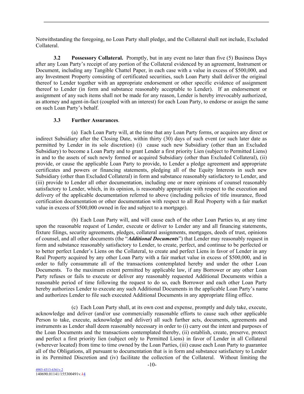 Notwithstanding the foregoing, no Loan Party shall pledge, and the Collateral shall not include, Excluded Collateral. 3.2 Possessory Collateral. Promptly, but in any event no later than five (5) Business Days after any Loan Party’s receipt of any portion of the Collateral evidenced by an agreement, Instrument or Document, including any Tangible Chattel Paper, in each case with a value in excess of $500,000, and any Investment Property consisting of certificated securities, such Loan Party shall deliver the original thereof to Lender together with an appropriate endorsement or other specific evidence of assignment thereof to Lender (in form and substance reasonably acceptable to Lender). If an endorsement or assignment of any such items shall not be made for any reason, Lender is hereby irrevocably authorized, as attorney and agent-in-fact (coupled with an interest) for each Loan Party, to endorse or assign the same on such Loan Party’s behalf. 3.3 Further Assurances. (a) Each Loan Party will, at the time that any Loan Party forms, or acquires any direct or indirect Subsidiary after the Closing Date, within thirty (30) days of such event (or such later date as permitted by Lender in its sole discretion) (i) cause such new Subsidiary (other than an Excluded Subsidiary) to become a Loan Party and to grant Lender a first priority Lien (subject to Permitted Liens) in and to the assets of such newly formed or acquired Subsidiary (other than Excluded Collateral), (ii) provide, or cause the applicable Loan Party to provide, to Lender a pledge agreement and appropriate certificates and powers or financing statements, pledging all of the Equity Interests in such new Subsidiary (other than Excluded Collateral) in form and substance reasonably satisfactory to Lender, and (iii) provide to Lender all other documentation, including one or more opinions of counsel reasonably satisfactory to Lender, which, in its opinion, is reasonably appropriate with respect to the execution and delivery of the applicable documentation referred to above (including policies of title insurance, flood certification documentation or other documentation with respect to all Real Property with a fair market value in excess of $500,000 owned in fee and subject to a mortgage). (b) Each Loan Party will, and will cause each of the other Loan Parties to, at any time upon the reasonable request of Lender, execute or deliver to Lender any and all financing statements, fixture filings, security agreements, pledges, collateral assignments, mortgages, deeds of trust, opinions of counsel, and all other documents (the “Additional Documents”) that Lender may reasonably request in form and substance reasonably satisfactory to Lender, to create, perfect, and continue to be perfected or to better perfect Lender’s Liens on the Collateral, to create and perfect Liens in favor of Lender in any Real Property acquired by any other Loan Party with a fair market value in excess of $500,000, and in order to fully consummate all of the transactions contemplated hereby and under the other Loan Documents. To the maximum extent permitted by applicable law, if any Borrower or any other Loan Party refuses or fails to execute or deliver any reasonably requested Additional Documents within a reasonable period of time following the request to do so, each Borrower and each other Loan Party hereby authorizes Lender to execute any such Additional Documents in the applicable Loan Party’s name and authorizes Lender to file such executed Additional Documents in any appropriate filing office. (c) Each Loan Party shall, at its own cost and expense, promptly and duly take, execute, acknowledge and deliver (and/or use commercially reasonable efforts to cause such other applicable Person to take, execute, acknowledge and deliver) all such further acts, documents, agreements and instruments as Lender shall deem reasonably necessary in order to (i) carry out the intent and purposes of the Loan Documents and the transactions contemplated thereby, (ii) establish, create, preserve, protect and perfect a first priority lien (subject only to Permitted Liens) in favor of Lender in all Collateral (wherever located) from time to time owned by the Loan Parties, (iii) cause each Loan Party to guarantee all of the Obligations, all pursuant to documentation that is in form and substance satisfactory to Lender in its Permitted Discretion and (iv) facilitate the collection of the Collateral. Without limiting the -10- 4903-4313-6361v.2 140690.01141/155300491v.14