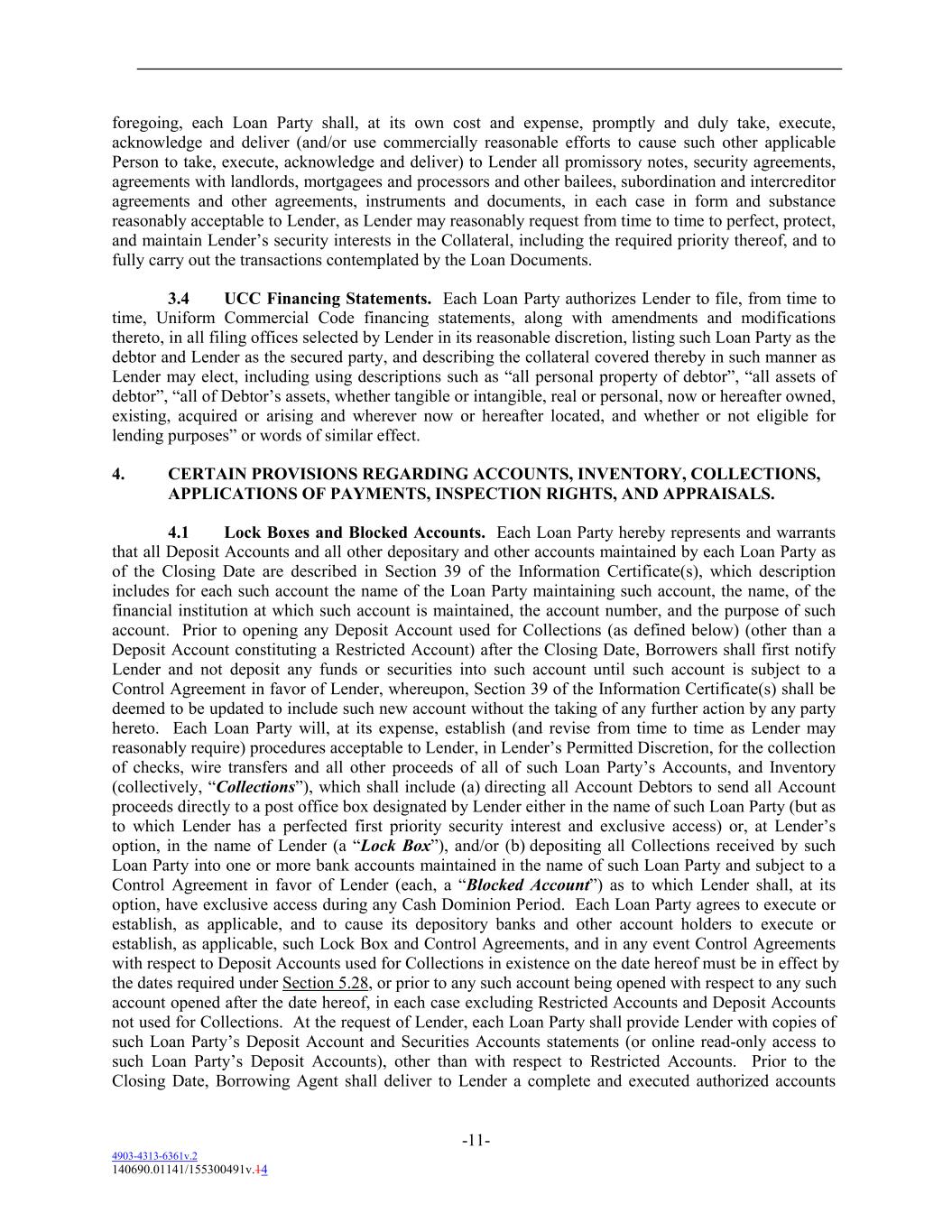 foregoing, each Loan Party shall, at its own cost and expense, promptly and duly take, execute, acknowledge and deliver (and/or use commercially reasonable efforts to cause such other applicable Person to take, execute, acknowledge and deliver) to Lender all promissory notes, security agreements, agreements with landlords, mortgagees and processors and other bailees, subordination and intercreditor agreements and other agreements, instruments and documents, in each case in form and substance reasonably acceptable to Lender, as Lender may reasonably request from time to time to perfect, protect, and maintain Lender’s security interests in the Collateral, including the required priority thereof, and to fully carry out the transactions contemplated by the Loan Documents. 3.4 UCC Financing Statements. Each Loan Party authorizes Lender to file, from time to time, Uniform Commercial Code financing statements, along with amendments and modifications thereto, in all filing offices selected by Lender in its reasonable discretion, listing such Loan Party as the debtor and Lender as the secured party, and describing the collateral covered thereby in such manner as Lender may elect, including using descriptions such as “all personal property of debtor”, “all assets of debtor”, “all of Debtor’s assets, whether tangible or intangible, real or personal, now or hereafter owned, existing, acquired or arising and wherever now or hereafter located, and whether or not eligible for lending purposes” or words of similar effect. 4. CERTAIN PROVISIONS REGARDING ACCOUNTS, INVENTORY, COLLECTIONS, APPLICATIONS OF PAYMENTS, INSPECTION RIGHTS, AND APPRAISALS. 4.1 Lock Boxes and Blocked Accounts. Each Loan Party hereby represents and warrants that all Deposit Accounts and all other depositary and other accounts maintained by each Loan Party as of the Closing Date are described in Section 39 of the Information Certificate(s), which description includes for each such account the name of the Loan Party maintaining such account, the name, of the financial institution at which such account is maintained, the account number, and the purpose of such account. Prior to opening any Deposit Account used for Collections (as defined below) (other than a Deposit Account constituting a Restricted Account) after the Closing Date, Borrowers shall first notify Lender and not deposit any funds or securities into such account until such account is subject to a Control Agreement in favor of Lender, whereupon, Section 39 of the Information Certificate(s) shall be deemed to be updated to include such new account without the taking of any further action by any party hereto. Each Loan Party will, at its expense, establish (and revise from time to time as Lender may reasonably require) procedures acceptable to Lender, in Lender’s Permitted Discretion, for the collection of checks, wire transfers and all other proceeds of all of such Loan Party’s Accounts, and Inventory (collectively, “Collections”), which shall include (a) directing all Account Debtors to send all Account proceeds directly to a post office box designated by Lender either in the name of such Loan Party (but as to which Lender has a perfected first priority security interest and exclusive access) or, at Lender’s option, in the name of Lender (a “Lock Box”), and/or (b) depositing all Collections received by such Loan Party into one or more bank accounts maintained in the name of such Loan Party and subject to a Control Agreement in favor of Lender (each, a “Blocked Account”) as to which Lender shall, at its option, have exclusive access during any Cash Dominion Period. Each Loan Party agrees to execute or establish, as applicable, and to cause its depository banks and other account holders to execute or establish, as applicable, such Lock Box and Control Agreements, and in any event Control Agreements with respect to Deposit Accounts used for Collections in existence on the date hereof must be in effect by the dates required under Section 5.28, or prior to any such account being opened with respect to any such account opened after the date hereof, in each case excluding Restricted Accounts and Deposit Accounts not used for Collections. At the request of Lender, each Loan Party shall provide Lender with copies of such Loan Party’s Deposit Account and Securities Accounts statements (or online read-only access to such Loan Party’s Deposit Accounts), other than with respect to Restricted Accounts. Prior to the Closing Date, Borrowing Agent shall deliver to Lender a complete and executed authorized accounts -11- 4903-4313-6361v.2 140690.01141/155300491v.14