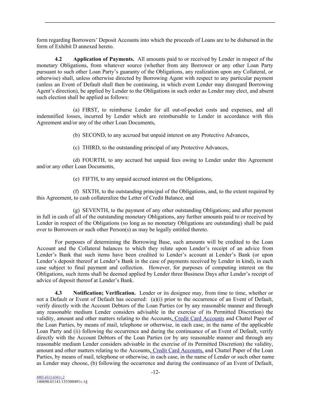 form regarding Borrowers’ Deposit Accounts into which the proceeds of Loans are to be disbursed in the form of Exhibit D annexed hereto. 4.2 Application of Payments. All amounts paid to or received by Lender in respect of the monetary Obligations, from whatever source (whether from any Borrower or any other Loan Party pursuant to such other Loan Party’s guaranty of the Obligations, any realization upon any Collateral, or otherwise) shall, unless otherwise directed by Borrowing Agent with respect to any particular payment (unless an Event of Default shall then be continuing, in which event Lender may disregard Borrowing Agent’s direction), be applied by Lender to the Obligations in such order as Lender may elect, and absent such election shall be applied as follows: (a) FIRST, to reimburse Lender for all out-of-pocket costs and expenses, and all indemnified losses, incurred by Lender which are reimbursable to Lender in accordance with this Agreement and/or any of the other Loan Documents, (b) SECOND, to any accrued but unpaid interest on any Protective Advances, (c) THIRD, to the outstanding principal of any Protective Advances, (d) FOURTH, to any accrued but unpaid fees owing to Lender under this Agreement and/or any other Loan Documents, (e) FIFTH, to any unpaid accrued interest on the Obligations, (f) SIXTH, to the outstanding principal of the Obligations, and, to the extent required by this Agreement, to cash collateralize the Letter of Credit Balance, and (g) SEVENTH, to the payment of any other outstanding Obligations; and after payment in full in cash of all of the outstanding monetary Obligations, any further amounts paid to or received by Lender in respect of the Obligations (so long as no monetary Obligations are outstanding) shall be paid over to Borrowers or such other Person(s) as may be legally entitled thereto. For purposes of determining the Borrowing Base, such amounts will be credited to the Loan Account and the Collateral balances to which they relate upon Lender’s receipt of an advice from Lender’s Bank that such items have been credited to Lender’s account at Lender’s Bank (or upon Lender’s deposit thereof at Lender’s Bank in the case of payments received by Lender in kind), in each case subject to final payment and collection. However, for purposes of computing interest on the Obligations, such items shall be deemed applied by Lender three Business Days after Lender’s receipt of advice of deposit thereof at Lender’s Bank. 4.3 Notification; Verification. Lender or its designee may, from time to time, whether or not a Default or Event of Default has occurred: (a)(i) prior to the occurrence of an Event of Default, verify directly with the Account Debtors of the Loan Parties (or by any reasonable manner and through any reasonable medium Lender considers advisable in the exercise of its Permitted Discretion) the validity, amount and other matters relating to the Accounts, Credit Card Accounts and Chattel Paper of the Loan Parties, by means of mail, telephone or otherwise, in each case, in the name of the applicable Loan Party and (ii) following the occurrence and during the continuance of an Event of Default, verify directly with the Account Debtors of the Loan Parties (or by any reasonable manner and through any reasonable medium Lender considers advisable in the exercise of its Permitted Discretion) the validity, amount and other matters relating to the Accounts, Credit Card Accounts, and Chattel Paper of the Loan Parties, by means of mail, telephone or otherwise, in each case, in the name of Lender or such other name as Lender may choose, (b) following the occurrence and during the continuance of an Event of Default, -12- 4903-4313-6361v.2 140690.01141/155300491v.14