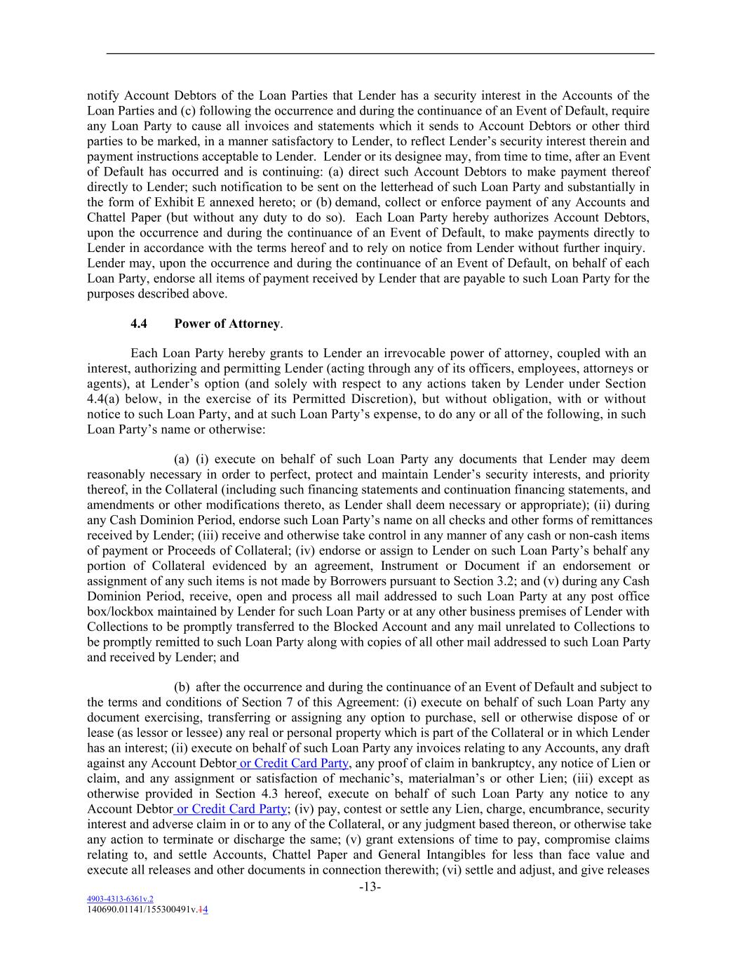 notify Account Debtors of the Loan Parties that Lender has a security interest in the Accounts of the Loan Parties and (c) following the occurrence and during the continuance of an Event of Default, require any Loan Party to cause all invoices and statements which it sends to Account Debtors or other third parties to be marked, in a manner satisfactory to Lender, to reflect Lender’s security interest therein and payment instructions acceptable to Lender. Lender or its designee may, from time to time, after an Event of Default has occurred and is continuing: (a) direct such Account Debtors to make payment thereof directly to Lender; such notification to be sent on the letterhead of such Loan Party and substantially in the form of Exhibit E annexed hereto; or (b) demand, collect or enforce payment of any Accounts and Chattel Paper (but without any duty to do so). Each Loan Party hereby authorizes Account Debtors, upon the occurrence and during the continuance of an Event of Default, to make payments directly to Lender in accordance with the terms hereof and to rely on notice from Lender without further inquiry. Lender may, upon the occurrence and during the continuance of an Event of Default, on behalf of each Loan Party, endorse all items of payment received by Lender that are payable to such Loan Party for the purposes described above. 4.4 Power of Attorney. Each Loan Party hereby grants to Lender an irrevocable power of attorney, coupled with an interest, authorizing and permitting Lender (acting through any of its officers, employees, attorneys or agents), at Lender’s option (and solely with respect to any actions taken by Lender under Section 4.4(a) below, in the exercise of its Permitted Discretion), but without obligation, with or without notice to such Loan Party, and at such Loan Party’s expense, to do any or all of the following, in such Loan Party’s name or otherwise: (a) (i) execute on behalf of such Loan Party any documents that Lender may deem reasonably necessary in order to perfect, protect and maintain Lender’s security interests, and priority thereof, in the Collateral (including such financing statements and continuation financing statements, and amendments or other modifications thereto, as Lender shall deem necessary or appropriate); (ii) during any Cash Dominion Period, endorse such Loan Party’s name on all checks and other forms of remittances received by Lender; (iii) receive and otherwise take control in any manner of any cash or non-cash items of payment or Proceeds of Collateral; (iv) endorse or assign to Lender on such Loan Party’s behalf any portion of Collateral evidenced by an agreement, Instrument or Document if an endorsement or assignment of any such items is not made by Borrowers pursuant to Section 3.2; and (v) during any Cash Dominion Period, receive, open and process all mail addressed to such Loan Party at any post office box/lockbox maintained by Lender for such Loan Party or at any other business premises of Lender with Collections to be promptly transferred to the Blocked Account and any mail unrelated to Collections to be promptly remitted to such Loan Party along with copies of all other mail addressed to such Loan Party and received by Lender; and (b) after the occurrence and during the continuance of an Event of Default and subject to the terms and conditions of Section 7 of this Agreement: (i) execute on behalf of such Loan Party any document exercising, transferring or assigning any option to purchase, sell or otherwise dispose of or lease (as lessor or lessee) any real or personal property which is part of the Collateral or in which Lender has an interest; (ii) execute on behalf of such Loan Party any invoices relating to any Accounts, any draft against any Account Debtor or Credit Card Party, any proof of claim in bankruptcy, any notice of Lien or claim, and any assignment or satisfaction of mechanic’s, materialman’s or other Lien; (iii) except as otherwise provided in Section 4.3 hereof, execute on behalf of such Loan Party any notice to any Account Debtor or Credit Card Party; (iv) pay, contest or settle any Lien, charge, encumbrance, security interest and adverse claim in or to any of the Collateral, or any judgment based thereon, or otherwise take any action to terminate or discharge the same; (v) grant extensions of time to pay, compromise claims relating to, and settle Accounts, Chattel Paper and General Intangibles for less than face value and execute all releases and other documents in connection therewith; (vi) settle and adjust, and give releases -13- 4903-4313-6361v.2 140690.01141/155300491v.14
