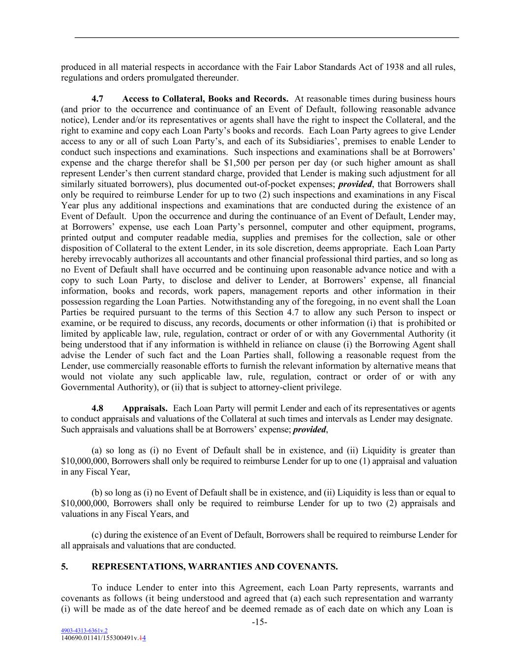 produced in all material respects in accordance with the Fair Labor Standards Act of 1938 and all rules, regulations and orders promulgated thereunder. 4.7 Access to Collateral, Books and Records. At reasonable times during business hours (and prior to the occurrence and continuance of an Event of Default, following reasonable advance notice), Lender and/or its representatives or agents shall have the right to inspect the Collateral, and the right to examine and copy each Loan Party’s books and records. Each Loan Party agrees to give Lender access to any or all of such Loan Party’s, and each of its Subsidiaries’, premises to enable Lender to conduct such inspections and examinations. Such inspections and examinations shall be at Borrowers’ expense and the charge therefor shall be $1,500 per person per day (or such higher amount as shall represent Lender’s then current standard charge, provided that Lender is making such adjustment for all similarly situated borrowers), plus documented out-of-pocket expenses; provided, that Borrowers shall only be required to reimburse Lender for up to two (2) such inspections and examinations in any Fiscal Year plus any additional inspections and examinations that are conducted during the existence of an Event of Default. Upon the occurrence and during the continuance of an Event of Default, Lender may, at Borrowers’ expense, use each Loan Party’s personnel, computer and other equipment, programs, printed output and computer readable media, supplies and premises for the collection, sale or other disposition of Collateral to the extent Lender, in its sole discretion, deems appropriate. Each Loan Party hereby irrevocably authorizes all accountants and other financial professional third parties, and so long as no Event of Default shall have occurred and be continuing upon reasonable advance notice and with a copy to such Loan Party, to disclose and deliver to Lender, at Borrowers’ expense, all financial information, books and records, work papers, management reports and other information in their possession regarding the Loan Parties. Notwithstanding any of the foregoing, in no event shall the Loan Parties be required pursuant to the terms of this Section 4.7 to allow any such Person to inspect or examine, or be required to discuss, any records, documents or other information (i) that is prohibited or limited by applicable law, rule, regulation, contract or order of or with any Governmental Authority (it being understood that if any information is withheld in reliance on clause (i) the Borrowing Agent shall advise the Lender of such fact and the Loan Parties shall, following a reasonable request from the Lender, use commercially reasonable efforts to furnish the relevant information by alternative means that would not violate any such applicable law, rule, regulation, contract or order of or with any Governmental Authority), or (ii) that is subject to attorney-client privilege. 4.8 Appraisals. Each Loan Party will permit Lender and each of its representatives or agents to conduct appraisals and valuations of the Collateral at such times and intervals as Lender may designate. Such appraisals and valuations shall be at Borrowers’ expense; provided, (a) so long as (i) no Event of Default shall be in existence, and (ii) Liquidity is greater than $10,000,000, Borrowers shall only be required to reimburse Lender for up to one (1) appraisal and valuation in any Fiscal Year, (b) so long as (i) no Event of Default shall be in existence, and (ii) Liquidity is less than or equal to $10,000,000, Borrowers shall only be required to reimburse Lender for up to two (2) appraisals and valuations in any Fiscal Years, and (c) during the existence of an Event of Default, Borrowers shall be required to reimburse Lender for all appraisals and valuations that are conducted. 5. REPRESENTATIONS, WARRANTIES AND COVENANTS. To induce Lender to enter into this Agreement, each Loan Party represents, warrants and covenants as follows (it being understood and agreed that (a) each such representation and warranty (i) will be made as of the date hereof and be deemed remade as of each date on which any Loan is -15- 4903-4313-6361v.2 140690.01141/155300491v.14