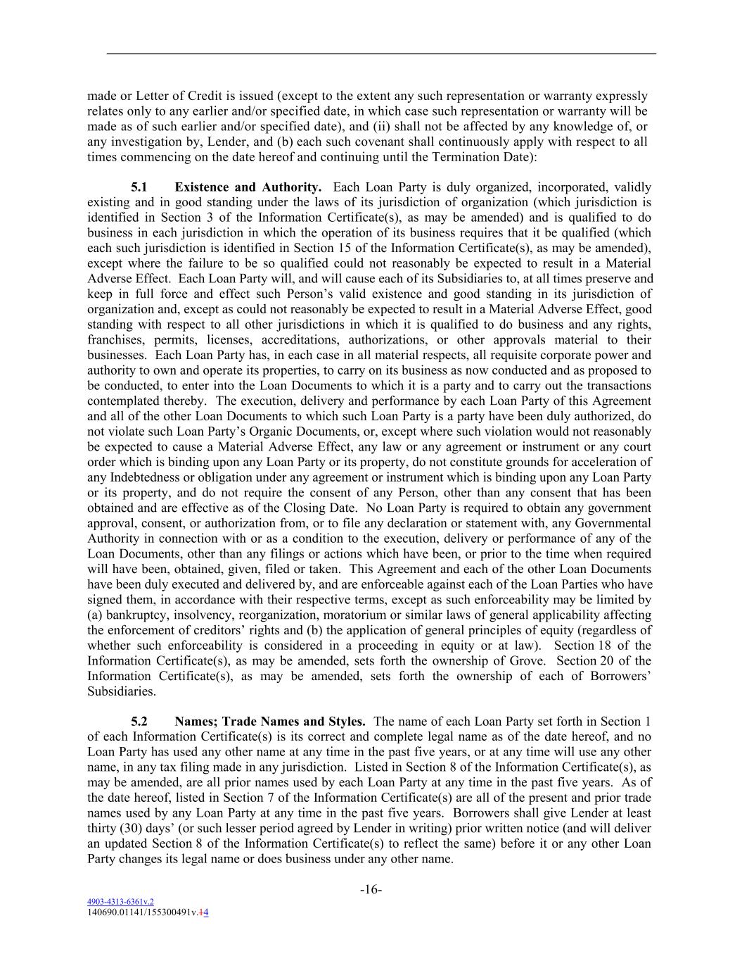 made or Letter of Credit is issued (except to the extent any such representation or warranty expressly relates only to any earlier and/or specified date, in which case such representation or warranty will be made as of such earlier and/or specified date), and (ii) shall not be affected by any knowledge of, or any investigation by, Lender, and (b) each such covenant shall continuously apply with respect to all times commencing on the date hereof and continuing until the Termination Date): 5.1 Existence and Authority. Each Loan Party is duly organized, incorporated, validly existing and in good standing under the laws of its jurisdiction of organization (which jurisdiction is identified in Section 3 of the Information Certificate(s), as may be amended) and is qualified to do business in each jurisdiction in which the operation of its business requires that it be qualified (which each such jurisdiction is identified in Section 15 of the Information Certificate(s), as may be amended), except where the failure to be so qualified could not reasonably be expected to result in a Material Adverse Effect. Each Loan Party will, and will cause each of its Subsidiaries to, at all times preserve and keep in full force and effect such Person’s valid existence and good standing in its jurisdiction of organization and, except as could not reasonably be expected to result in a Material Adverse Effect, good standing with respect to all other jurisdictions in which it is qualified to do business and any rights, franchises, permits, licenses, accreditations, authorizations, or other approvals material to their businesses. Each Loan Party has, in each case in all material respects, all requisite corporate power and authority to own and operate its properties, to carry on its business as now conducted and as proposed to be conducted, to enter into the Loan Documents to which it is a party and to carry out the transactions contemplated thereby. The execution, delivery and performance by each Loan Party of this Agreement and all of the other Loan Documents to which such Loan Party is a party have been duly authorized, do not violate such Loan Party’s Organic Documents, or, except where such violation would not reasonably be expected to cause a Material Adverse Effect, any law or any agreement or instrument or any court order which is binding upon any Loan Party or its property, do not constitute grounds for acceleration of any Indebtedness or obligation under any agreement or instrument which is binding upon any Loan Party or its property, and do not require the consent of any Person, other than any consent that has been obtained and are effective as of the Closing Date. No Loan Party is required to obtain any government approval, consent, or authorization from, or to file any declaration or statement with, any Governmental Authority in connection with or as a condition to the execution, delivery or performance of any of the Loan Documents, other than any filings or actions which have been, or prior to the time when required will have been, obtained, given, filed or taken. This Agreement and each of the other Loan Documents have been duly executed and delivered by, and are enforceable against each of the Loan Parties who have signed them, in accordance with their respective terms, except as such enforceability may be limited by (a) bankruptcy, insolvency, reorganization, moratorium or similar laws of general applicability affecting the enforcement of creditors’ rights and (b) the application of general principles of equity (regardless of whether such enforceability is considered in a proceeding in equity or at law). Section 18 of the Information Certificate(s), as may be amended, sets forth the ownership of Grove. Section 20 of the Information Certificate(s), as may be amended, sets forth the ownership of each of Borrowers’ Subsidiaries. 5.2 Names; Trade Names and Styles. The name of each Loan Party set forth in Section 1 of each Information Certificate(s) is its correct and complete legal name as of the date hereof, and no Loan Party has used any other name at any time in the past five years, or at any time will use any other name, in any tax filing made in any jurisdiction. Listed in Section 8 of the Information Certificate(s), as may be amended, are all prior names used by each Loan Party at any time in the past five years. As of the date hereof, listed in Section 7 of the Information Certificate(s) are all of the present and prior trade names used by any Loan Party at any time in the past five years. Borrowers shall give Lender at least thirty (30) days’ (or such lesser period agreed by Lender in writing) prior written notice (and will deliver an updated Section 8 of the Information Certificate(s) to reflect the same) before it or any other Loan Party changes its legal name or does business under any other name. -16- 4903-4313-6361v.2 140690.01141/155300491v.14