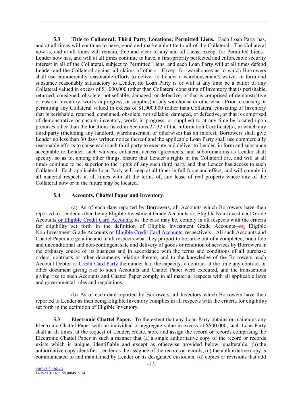 5.3 Title to Collateral; Third Party Locations; Permitted Liens. Each Loan Party has, and at all times will continue to have, good and marketable title to all of the Collateral. The Collateral now is, and at all times will remain, free and clear of any and all Liens, except for Permitted Liens. Lender now has, and will at all times continue to have, a first-priority perfected and enforceable security interest in all of the Collateral, subject to Permitted Liens, and each Loan Party will at all times defend Lender and the Collateral against all claims of others. Except for warehouses as to which Borrowers shall use commercially reasonable efforts to deliver to Lender a warehouseman’s waiver in form and substance reasonably satisfactory to Lender, no Loan Party is or will at any time be a bailor of any Collateral valued in excess of $1,000,000 (other than Collateral consisting of Inventory that is perishable, returned, consigned, obsolete, not sellable, damaged, or defective, or that is comprised of demonstrative or custom inventory, works in progress, or supplies) at any warehouse or otherwise. Prior to causing or permitting any Collateral valued in excess of $1,000,000 (other than Collateral consisting of Inventory that is perishable, returned, consigned, obsolete, not sellable, damaged, or defective, or that is comprised of demonstrative or custom inventory, works in progress, or supplies) to at any time be located upon premises other than the locations listed in Sections 27-32 of the Information Certificate(s), in which any third party (including any landlord, warehouseman, or otherwise) has an interest, Borrowers shall give Lender no less than 30 days written notice thereof and the applicable Loan Party shall use commercially reasonable efforts to cause each such third party to execute and deliver to Lender, in form and substance acceptable to Lender, such waivers, collateral access agreements, and subordinations as Lender shall specify, so as to, among other things, ensure that Lender’s rights in the Collateral are, and will at all times continue to be, superior to the rights of any such third party and that Lender has access to such Collateral. Each applicable Loan Party will keep at all times in full force and effect, and will comply in all material respects at all times with all the terms of, any lease of real property where any of the Collateral now or in the future may be located. 5.4 Accounts, Chattel Paper and Inventory. (a) As of each date reported by Borrowers, all Accounts which Borrowers have then reported to Lender as then being Eligible Investment Grade Accounts or, Eligible Non-Investment Grade Accounts or Eligible Credit Card Accounts, as the case may be, comply in all respects with the criteria for eligibility set forth in the definition of Eligible Investment Grade Accounts or, Eligible Non-Investment Grade Accounts or Eligible Credit Card Accounts, respectively. All such Accounts and Chattel Paper are genuine and in all respects what they purport to be, arise out of a completed, bona fide and unconditional and non-contingent sale and delivery of goods or rendition of services by Borrowers in the ordinary course of its business and in accordance with the terms and conditions of all purchase orders, contracts or other documents relating thereto, and to the knowledge of the Borrowers, each Account Debtor or Credit Card Party thereunder had the capacity to contract at the time any contract or other document giving rise to such Accounts and Chattel Paper were executed, and the transactions giving rise to such Accounts and Chattel Paper comply in all material respects with all applicable laws and governmental rules and regulations. (b) As of each date reported by Borrowers, all Inventory which Borrowers have then reported to Lender as then being Eligible Inventory complies in all respects with the criteria for eligibility set forth in the definition of Eligible Inventory. 5.5 Electronic Chattel Paper. To the extent that any Loan Party obtains or maintains any Electronic Chattel Paper with an individual or aggregate value in excess of $500,000, such Loan Party shall at all times, at the request of Lender, create, store and assign the record or records comprising the Electronic Chattel Paper in such a manner that (a) a single authoritative copy of the record or records exists which is unique, identifiable and except as otherwise provided below, unalterable, (b) the authoritative copy identifies Lender as the assignee of the record or records, (c) the authoritative copy is communicated to and maintained by Lender or its designated custodian, (d) copies or revisions that add -17- 4903-4313-6361v.2 140690.01141/155300491v.14