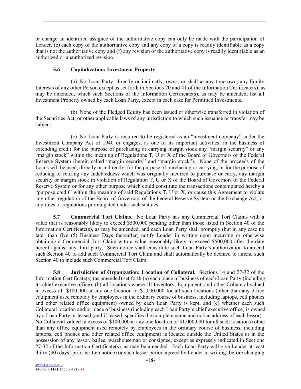 or change an identified assignee of the authoritative copy can only be made with the participation of Lender, (e) each copy of the authoritative copy and any copy of a copy is readily identifiable as a copy that is not the authoritative copy and (f) any revision of the authoritative copy is readily identifiable as an authorized or unauthorized revision. 5.6 Capitalization; Investment Property. (a) No Loan Party, directly or indirectly, owns, or shall at any time own, any Equity Interests of any other Person except as set forth in Sections 20 and 41 of the Information Certificate(s), as may be amended, which such Sections of the Information Certificate(s), as may be amended, list all Investment Property owned by each Loan Party, except in each case for Permitted Investments. (b) None of the Pledged Equity has been issued or otherwise transferred in violation of the Securities Act, or other applicable laws of any jurisdiction to which such issuance or transfer may be subject. (c) No Loan Party is required to be registered as an “investment company” under the Investment Company Act of 1940 or engages, as one of its important activities, in the business of extending credit for the purpose of purchasing or carrying margin stock any “margin security” or any “margin stock” within the meaning of Regulations T, U or X of the Board of Governors of the Federal Reserve System (herein called “margin security” and “margin stock”). None of the proceeds of the Loans will be used, directly or indirectly, for the purpose of purchasing or carrying, or for the purpose of reducing or retiring any Indebtedness which was originally incurred to purchase or carry, any margin security or margin stock in violation of Regulation T, U or X of the Board of Governors of the Federal Reserve System or for any other purpose which could constitute the transactions contemplated hereby a “purpose credit” within the meaning of said Regulations T, U or X, or cause this Agreement to violate any other regulation of the Board of Governors of the Federal Reserve System or the Exchange Act, or any rules or regulations promulgated under such statutes. 5.7 Commercial Tort Claims. No Loan Party has any Commercial Tort Claims with a value that is reasonably likely to exceed $500,000 pending other than those listed in Section 40 of the Information Certificate(s), as may be amended, and each Loan Party shall promptly (but in any case no later than five (5) Business Days thereafter) notify Lender in writing upon incurring or otherwise obtaining a Commercial Tort Claim with a value reasonably likely to exceed $500,000 after the date hereof against any third party. Such notice shall constitute such Loan Party’s authorization to amend such Section 40 to add such Commercial Tort Claim and shall automatically be deemed to amend such Section 40 to include such Commercial Tort Claim. 5.8 Jurisdiction of Organization; Location of Collateral. Sections 14 and 27-32 of the Information Certificate(s) (as amended) set forth (a) each place of business of each Loan Party (including its chief executive office), (b) all locations where all Inventory, Equipment, and other Collateral valued in excess of $100,000 at any one location or $1,000,000 for all such locations (other than any office equipment used remotely by employees in the ordinary course of business, including laptops, cell phones and other related office equipment) owned by each Loan Party is kept, and (c) whether each such Collateral location and/or place of business (including each Loan Party’s chief executive office) is owned by a Loan Party or leased (and if leased, specifies the complete name and notice address of each lessor). No Collateral valued in excess of $100,000 at any one location or $1,000,000 for all such locations (other than any office equipment used remotely by employees in the ordinary course of business, including laptops, cell phones and other related office equipment) is located outside the United States or in the possession of any lessor, bailee, warehouseman or consignee, except as expressly indicated in Sections 27-32 of the Information Certificate(s), as may be amended. Each Loan Party will give Lender at least thirty (30) days’ prior written notice (or such lesser period agreed by Lender in writing) before changing -18- 4903-4313-6361v.2 140690.01141/155300491v.14