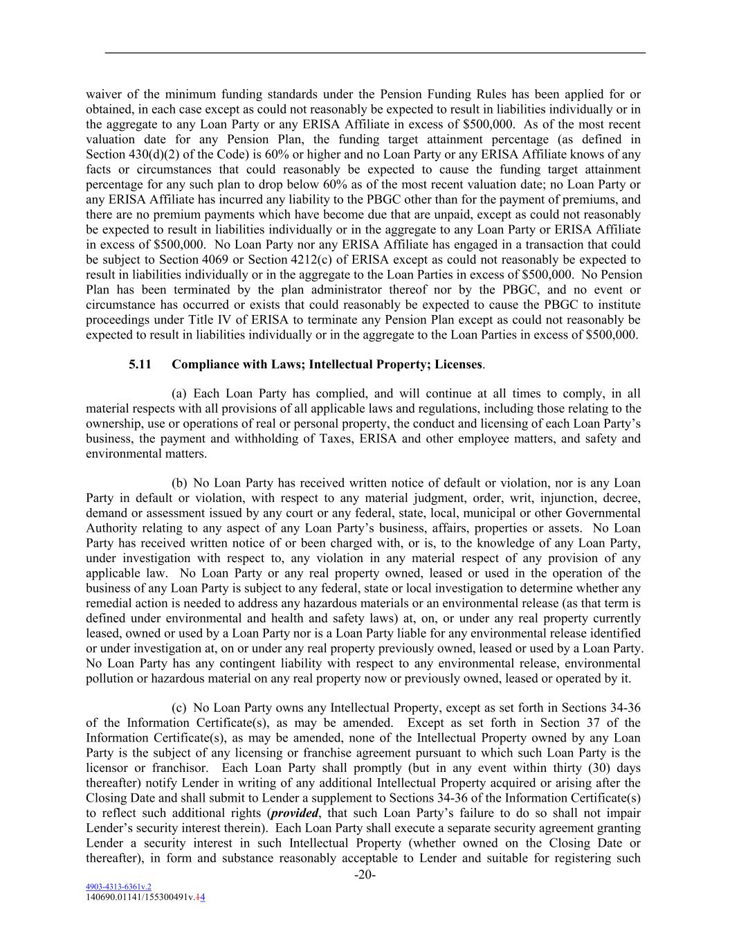 waiver of the minimum funding standards under the Pension Funding Rules has been applied for or obtained, in each case except as could not reasonably be expected to result in liabilities individually or in the aggregate to any Loan Party or any ERISA Affiliate in excess of $500,000. As of the most recent valuation date for any Pension Plan, the funding target attainment percentage (as defined in Section 430(d)(2) of the Code) is 60% or higher and no Loan Party or any ERISA Affiliate knows of any facts or circumstances that could reasonably be expected to cause the funding target attainment percentage for any such plan to drop below 60% as of the most recent valuation date; no Loan Party or any ERISA Affiliate has incurred any liability to the PBGC other than for the payment of premiums, and there are no premium payments which have become due that are unpaid, except as could not reasonably be expected to result in liabilities individually or in the aggregate to any Loan Party or ERISA Affiliate in excess of $500,000. No Loan Party nor any ERISA Affiliate has engaged in a transaction that could be subject to Section 4069 or Section 4212(c) of ERISA except as could not reasonably be expected to result in liabilities individually or in the aggregate to the Loan Parties in excess of $500,000. No Pension Plan has been terminated by the plan administrator thereof nor by the PBGC, and no event or circumstance has occurred or exists that could reasonably be expected to cause the PBGC to institute proceedings under Title IV of ERISA to terminate any Pension Plan except as could not reasonably be expected to result in liabilities individually or in the aggregate to the Loan Parties in excess of $500,000. 5.11 Compliance with Laws; Intellectual Property; Licenses. (a) Each Loan Party has complied, and will continue at all times to comply, in all material respects with all provisions of all applicable laws and regulations, including those relating to the ownership, use or operations of real or personal property, the conduct and licensing of each Loan Party’s business, the payment and withholding of Taxes, ERISA and other employee matters, and safety and environmental matters. (b) No Loan Party has received written notice of default or violation, nor is any Loan Party in default or violation, with respect to any material judgment, order, writ, injunction, decree, demand or assessment issued by any court or any federal, state, local, municipal or other Governmental Authority relating to any aspect of any Loan Party’s business, affairs, properties or assets. No Loan Party has received written notice of or been charged with, or is, to the knowledge of any Loan Party, under investigation with respect to, any violation in any material respect of any provision of any applicable law. No Loan Party or any real property owned, leased or used in the operation of the business of any Loan Party is subject to any federal, state or local investigation to determine whether any remedial action is needed to address any hazardous materials or an environmental release (as that term is defined under environmental and health and safety laws) at, on, or under any real property currently leased, owned or used by a Loan Party nor is a Loan Party liable for any environmental release identified or under investigation at, on or under any real property previously owned, leased or used by a Loan Party. No Loan Party has any contingent liability with respect to any environmental release, environmental pollution or hazardous material on any real property now or previously owned, leased or operated by it. (c) No Loan Party owns any Intellectual Property, except as set forth in Sections 34-36 of the Information Certificate(s), as may be amended. Except as set forth in Section 37 of the Information Certificate(s), as may be amended, none of the Intellectual Property owned by any Loan Party is the subject of any licensing or franchise agreement pursuant to which such Loan Party is the licensor or franchisor. Each Loan Party shall promptly (but in any event within thirty (30) days thereafter) notify Lender in writing of any additional Intellectual Property acquired or arising after the Closing Date and shall submit to Lender a supplement to Sections 34-36 of the Information Certificate(s) to reflect such additional rights (provided, that such Loan Party’s failure to do so shall not impair Lender’s security interest therein). Each Loan Party shall execute a separate security agreement granting Lender a security interest in such Intellectual Property (whether owned on the Closing Date or thereafter), in form and substance reasonably acceptable to Lender and suitable for registering such -20- 4903-4313-6361v.2 140690.01141/155300491v.14