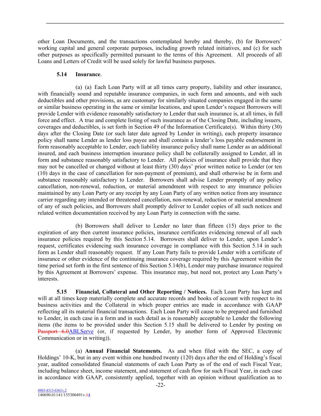 other Loan Documents, and the transactions contemplated hereby and thereby, (b) for Borrowers’ working capital and general corporate purposes, including growth related initiatives, and (c) for such other purposes as specifically permitted pursuant to the terms of this Agreement. All proceeds of all Loans and Letters of Credit will be used solely for lawful business purposes. 5.14 Insurance. (a) (a) Each Loan Party will at all times carry property, liability and other insurance, with financially sound and reputable insurance companies, in such form and amounts, and with such deductibles and other provisions, as are customary for similarly situated companies engaged in the same or similar business operating in the same or similar locations, and upon Lender’s request Borrowers will provide Lender with evidence reasonably satisfactory to Lender that such insurance is, at all times, in full force and effect. A true and complete listing of such insurance as of the Closing Date, including issuers, coverages and deductibles, is set forth in Section 49 of the Information Certificate(s). Within thirty (30) days after the Closing Date (or such later date agreed by Lender in writing), each property insurance policy shall name Lender as lender loss payee and shall contain a lender’s loss payable endorsement in form reasonably acceptable to Lender, each liability insurance policy shall name Lender as an additional insured, and each business interruption insurance policy shall be collaterally assigned to Lender, all in form and substance reasonably satisfactory to Lender. All policies of insurance shall provide that they may not be cancelled or changed without at least thirty (30) days’ prior written notice to Lender (or ten (10) days in the case of cancellation for non-payment of premium), and shall otherwise be in form and substance reasonably satisfactory to Lender. Borrowers shall advise Lender promptly of any policy cancellation, non-renewal, reduction, or material amendment with respect to any insurance policies maintained by any Loan Party or any receipt by any Loan Party of any written notice from any insurance carrier regarding any intended or threatened cancellation, non-renewal, reduction or material amendment of any of such policies, and Borrowers shall promptly deliver to Lender copies of all such notices and related written documentation received by any Loan Party in connection with the same. (b) Borrowers shall deliver to Lender no later than fifteen (15) days prior to the expiration of any then current insurance policies, insurance certificates evidencing renewal of all such insurance policies required by this Section 5.14. Borrowers shall deliver to Lender, upon Lender’s request, certificates evidencing such insurance coverage in compliance with this Section 5.14 in such form as Lender shall reasonably request. If any Loan Party fails to provide Lender with a certificate of insurance or other evidence of the continuing insurance coverage required by this Agreement within the time period set forth in the first sentence of this Section 5.14(b), Lender may purchase insurance required by this Agreement at Borrowers’ expense. This insurance may, but need not, protect any Loan Party’s interests. 5.15 Financial, Collateral and Other Reporting / Notices. Each Loan Party has kept and will at all times keep materially complete and accurate records and books of account with respect to its business activities and the Collateral in which proper entries are made in accordance with GAAP reflecting all its material financial transactions. Each Loan Party will cause to be prepared and furnished to Lender, in each case in a form and in such detail as is reasonably acceptable to Lender the following items (the items to be provided under this Section 5.15 shall be delivered to Lender by posting on Passport 6.0ABLServe (or, if requested by Lender, by another form of Approved Electronic Communication or in writing)). (a) Annual Financial Statements. As and when filed with the SEC, a copy of Holdings’ 10-K, but in any event within one hundred twenty (120) days after the end of Holding’s fiscal year, audited consolidated financial statements of each Loan Party as of the end of such Fiscal Year, including balance sheet, income statement, and statement of cash flow for such Fiscal Year, in each case in accordance with GAAP, consistently applied, together with an opinion without qualification as to -22- 4903-4313-6361v.2 140690.01141/155300491v.14