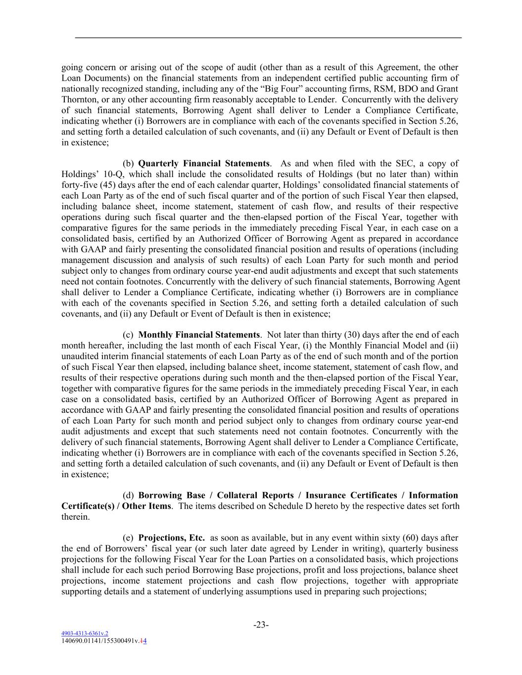going concern or arising out of the scope of audit (other than as a result of this Agreement, the other Loan Documents) on the financial statements from an independent certified public accounting firm of nationally recognized standing, including any of the “Big Four” accounting firms, RSM, BDO and Grant Thornton, or any other accounting firm reasonably acceptable to Lender. Concurrently with the delivery of such financial statements, Borrowing Agent shall deliver to Lender a Compliance Certificate, indicating whether (i) Borrowers are in compliance with each of the covenants specified in Section 5.26, and setting forth a detailed calculation of such covenants, and (ii) any Default or Event of Default is then in existence; (b) Quarterly Financial Statements. As and when filed with the SEC, a copy of Holdings’ 10-Q, which shall include the consolidated results of Holdings (but no later than) within forty-five (45) days after the end of each calendar quarter, Holdings’ consolidated financial statements of each Loan Party as of the end of such fiscal quarter and of the portion of such Fiscal Year then elapsed, including balance sheet, income statement, statement of cash flow, and results of their respective operations during such fiscal quarter and the then-elapsed portion of the Fiscal Year, together with comparative figures for the same periods in the immediately preceding Fiscal Year, in each case on a consolidated basis, certified by an Authorized Officer of Borrowing Agent as prepared in accordance with GAAP and fairly presenting the consolidated financial position and results of operations (including management discussion and analysis of such results) of each Loan Party for such month and period subject only to changes from ordinary course year-end audit adjustments and except that such statements need not contain footnotes. Concurrently with the delivery of such financial statements, Borrowing Agent shall deliver to Lender a Compliance Certificate, indicating whether (i) Borrowers are in compliance with each of the covenants specified in Section 5.26, and setting forth a detailed calculation of such covenants, and (ii) any Default or Event of Default is then in existence; (c) Monthly Financial Statements. Not later than thirty (30) days after the end of each month hereafter, including the last month of each Fiscal Year, (i) the Monthly Financial Model and (ii) unaudited interim financial statements of each Loan Party as of the end of such month and of the portion of such Fiscal Year then elapsed, including balance sheet, income statement, statement of cash flow, and results of their respective operations during such month and the then-elapsed portion of the Fiscal Year, together with comparative figures for the same periods in the immediately preceding Fiscal Year, in each case on a consolidated basis, certified by an Authorized Officer of Borrowing Agent as prepared in accordance with GAAP and fairly presenting the consolidated financial position and results of operations of each Loan Party for such month and period subject only to changes from ordinary course year-end audit adjustments and except that such statements need not contain footnotes. Concurrently with the delivery of such financial statements, Borrowing Agent shall deliver to Lender a Compliance Certificate, indicating whether (i) Borrowers are in compliance with each of the covenants specified in Section 5.26, and setting forth a detailed calculation of such covenants, and (ii) any Default or Event of Default is then in existence; (d) Borrowing Base / Collateral Reports / Insurance Certificates / Information Certificate(s) / Other Items. The items described on Schedule D hereto by the respective dates set forth therein. (e) Projections, Etc. as soon as available, but in any event within sixty (60) days after the end of Borrowers’ fiscal year (or such later date agreed by Lender in writing), quarterly business projections for the following Fiscal Year for the Loan Parties on a consolidated basis, which projections shall include for each such period Borrowing Base projections, profit and loss projections, balance sheet projections, income statement projections and cash flow projections, together with appropriate supporting details and a statement of underlying assumptions used in preparing such projections; -23- 4903-4313-6361v.2 140690.01141/155300491v.14