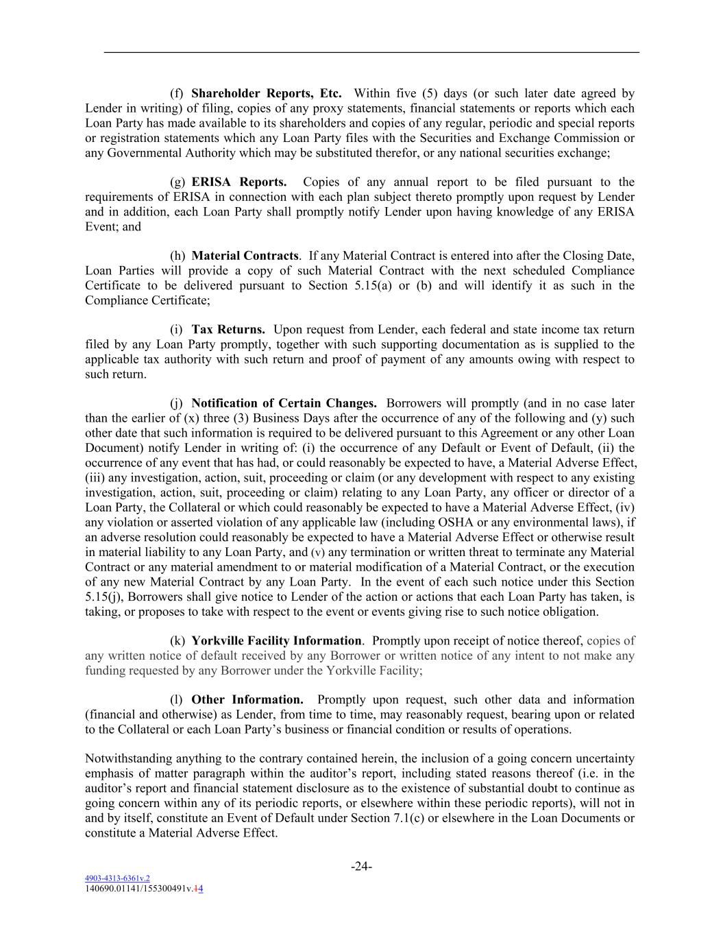 (f) Shareholder Reports, Etc. Within five (5) days (or such later date agreed by Lender in writing) of filing, copies of any proxy statements, financial statements or reports which each Loan Party has made available to its shareholders and copies of any regular, periodic and special reports or registration statements which any Loan Party files with the Securities and Exchange Commission or any Governmental Authority which may be substituted therefor, or any national securities exchange; (g) ERISA Reports. Copies of any annual report to be filed pursuant to the requirements of ERISA in connection with each plan subject thereto promptly upon request by Lender and in addition, each Loan Party shall promptly notify Lender upon having knowledge of any ERISA Event; and (h) Material Contracts. If any Material Contract is entered into after the Closing Date, Loan Parties will provide a copy of such Material Contract with the next scheduled Compliance Certificate to be delivered pursuant to Section 5.15(a) or (b) and will identify it as such in the Compliance Certificate; (i) Tax Returns. Upon request from Lender, each federal and state income tax return filed by any Loan Party promptly, together with such supporting documentation as is supplied to the applicable tax authority with such return and proof of payment of any amounts owing with respect to such return. (j) Notification of Certain Changes. Borrowers will promptly (and in no case later than the earlier of (x) three (3) Business Days after the occurrence of any of the following and (y) such other date that such information is required to be delivered pursuant to this Agreement or any other Loan Document) notify Lender in writing of: (i) the occurrence of any Default or Event of Default, (ii) the occurrence of any event that has had, or could reasonably be expected to have, a Material Adverse Effect, (iii) any investigation, action, suit, proceeding or claim (or any development with respect to any existing investigation, action, suit, proceeding or claim) relating to any Loan Party, any officer or director of a Loan Party, the Collateral or which could reasonably be expected to have a Material Adverse Effect, (iv) any violation or asserted violation of any applicable law (including OSHA or any environmental laws), if an adverse resolution could reasonably be expected to have a Material Adverse Effect or otherwise result in material liability to any Loan Party, and (v) any termination or written threat to terminate any Material Contract or any material amendment to or material modification of a Material Contract, or the execution of any new Material Contract by any Loan Party. In the event of each such notice under this Section 5.15(j), Borrowers shall give notice to Lender of the action or actions that each Loan Party has taken, is taking, or proposes to take with respect to the event or events giving rise to such notice obligation. (k) Yorkville Facility Information. Promptly upon receipt of notice thereof, copies of any written notice of default received by any Borrower or written notice of any intent to not make any funding requested by any Borrower under the Yorkville Facility; (l) Other Information. Promptly upon request, such other data and information (financial and otherwise) as Lender, from time to time, may reasonably request, bearing upon or related to the Collateral or each Loan Party’s business or financial condition or results of operations. Notwithstanding anything to the contrary contained herein, the inclusion of a going concern uncertainty emphasis of matter paragraph within the auditor’s report, including stated reasons thereof (i.e. in the auditor’s report and financial statement disclosure as to the existence of substantial doubt to continue as going concern within any of its periodic reports, or elsewhere within these periodic reports), will not in and by itself, constitute an Event of Default under Section 7.1(c) or elsewhere in the Loan Documents or constitute a Material Adverse Effect. -24- 4903-4313-6361v.2 140690.01141/155300491v.14